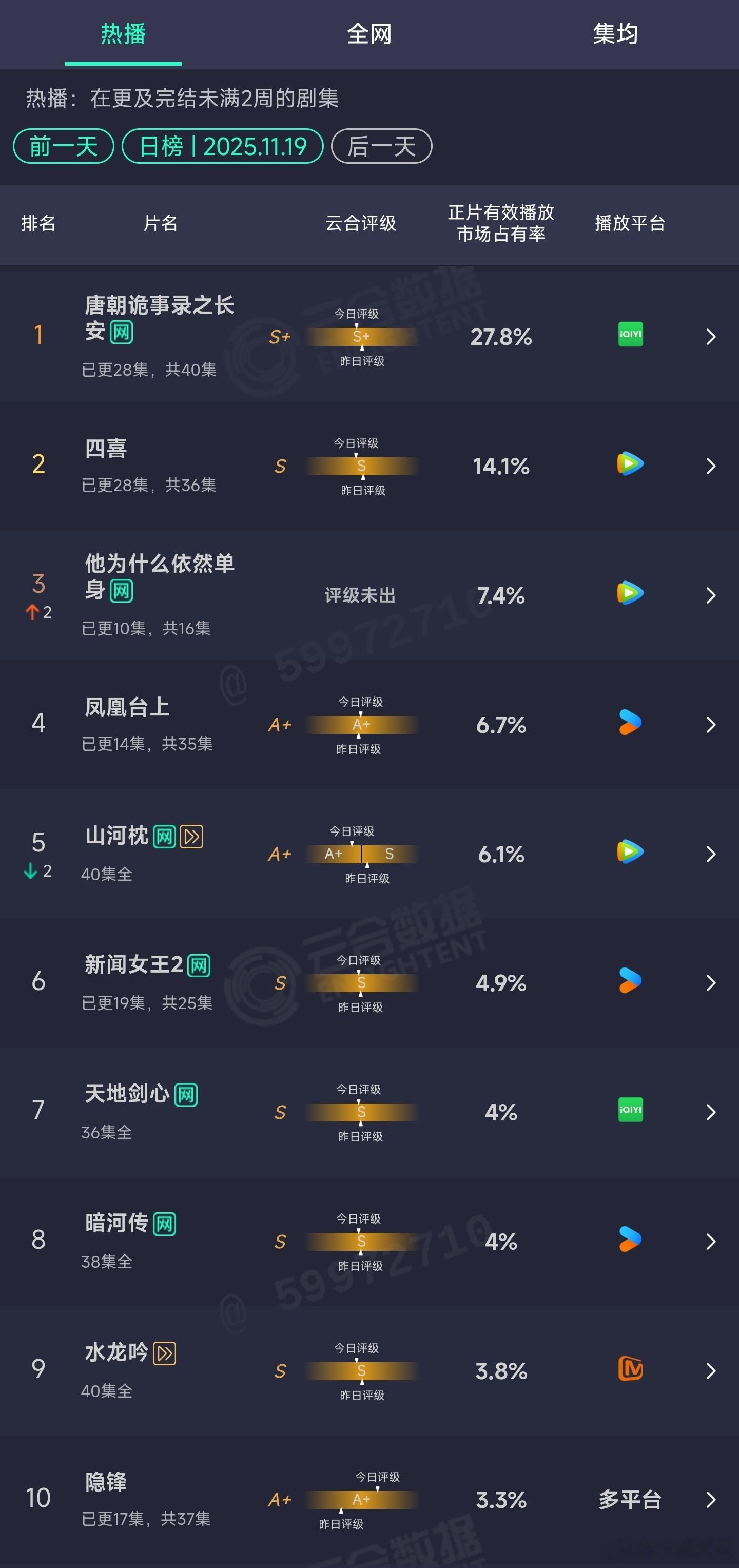 山河枕 周一热度如期下跌,已经够扑了,所以跌得也不多[doge]