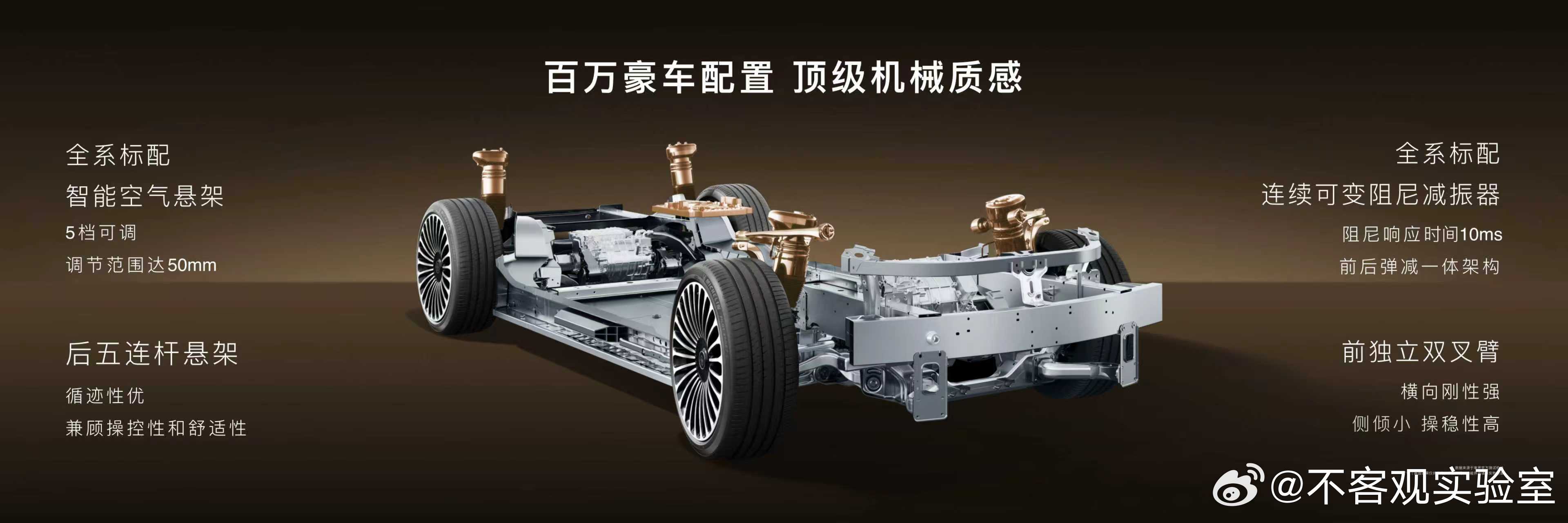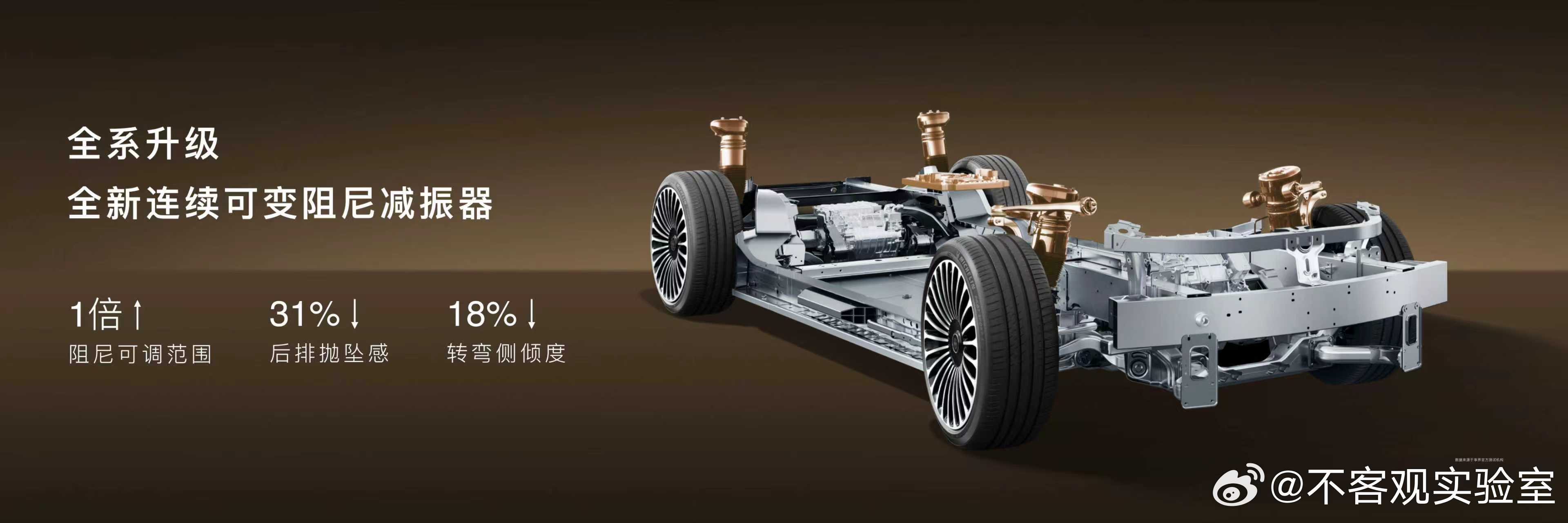 新款享界S9全系标配5档可调智能空气悬架、全新连续可变阻尼减振器;搭载全新华为途灵平台,采用尊界同源全新六合一全域融合架构,支持连续空间模型构建,带来全维协同控制,实现更智慧的车身控制;新车涉水深度达430mm,无惧湿滑;晕车舒缓2.0实现久坐不晕;此外,新车麋鹿测试成绩达84.1km/h、零百制动达32.32m,操控性能出众。