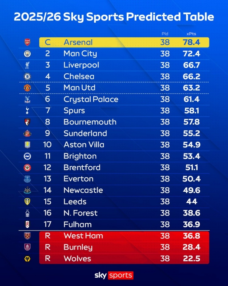 天空体育预测本赛季英超最终排名(积分为模拟10万次的平均值)