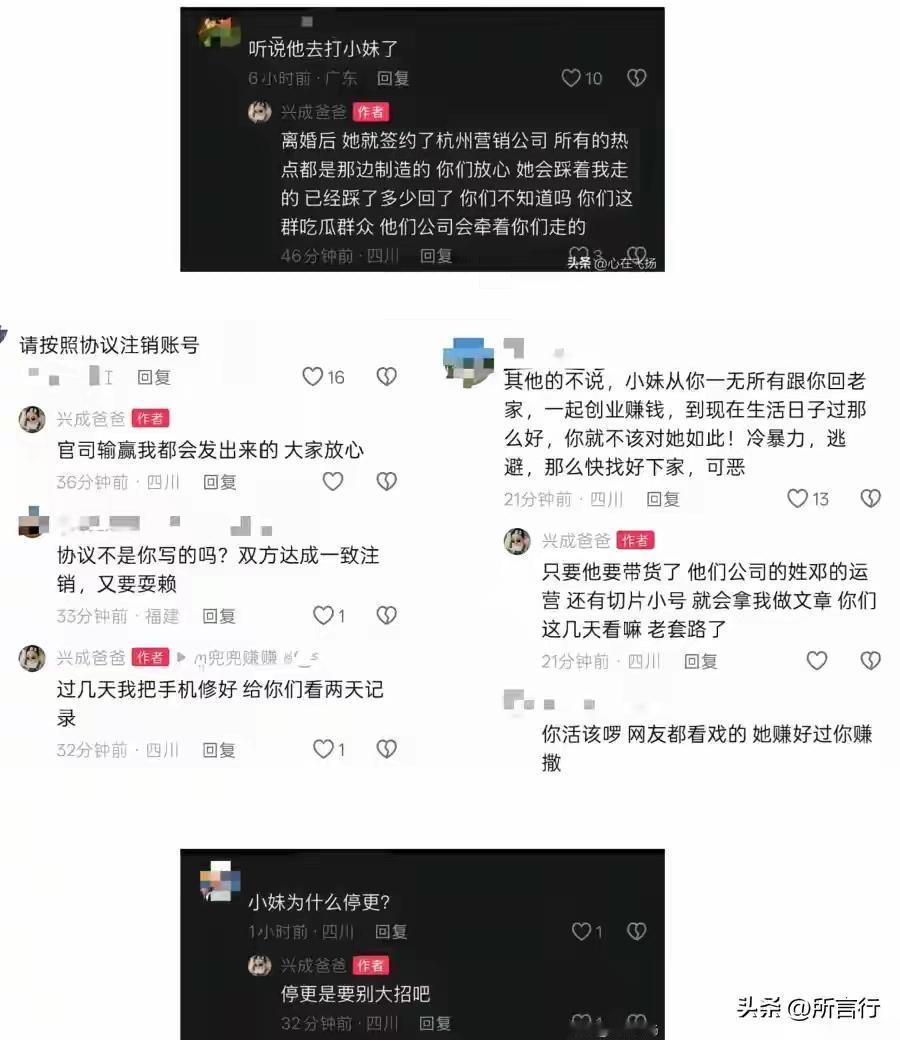 小妹儿的幺舅今天在带货,流量可以。 小妹儿停更,流量更猛, 小二娃陷入粉丝闹剧里面,流量更厉害。 [呲牙][呲牙][我想静静][我想静静]。 小妹儿粉丝说小妹儿停更是因为小二娃去打小妹儿了。[呲牙] 小二娃说她停更在“别”大招呢![我想静静] 小妹儿去哪里不知道?反正小二娃没有打她,不是粉丝说那种人。 反倒小妹儿前前夫离婚是打架打离的,当初是幺舅逼她嫁给她的前前夫[我想静静] 。 小二娃说小妹儿有一个儿子前前夫那里,她前前喊她去在遂宁抚大儿子了。 小妹儿到现在什么也没有给小二娃过户,名下所有财产和公司都在小妹儿那里。 小二娃说小妹儿去告他了,无论小二娃他的官司输赢他都会发出来,让大家放心。 小二娃准备去修手机,让大家看一下两天的他们的聊天记录。 小二娃说小妹儿离婚后签了杭州某公司,只要小妹儿要带货,就拉踩着小二娃让吃瓜群众看,还牵着吃瓜群众走。 小二娃说的话真实性更令人信服。 哎,离婚了翻脸了,大家都要解释清楚啊! 小妹儿忘了她的来时路,一直有粉丝都说她带起小二娃,小二娃是不服的。 小二娃认识她的第一天就骗小二娃去做传销,第一天就吵架了。[呲牙][呲牙] 小妹公开谈离婚 小二娃婚变 小妹儿情感 川乡小妹儿婚变