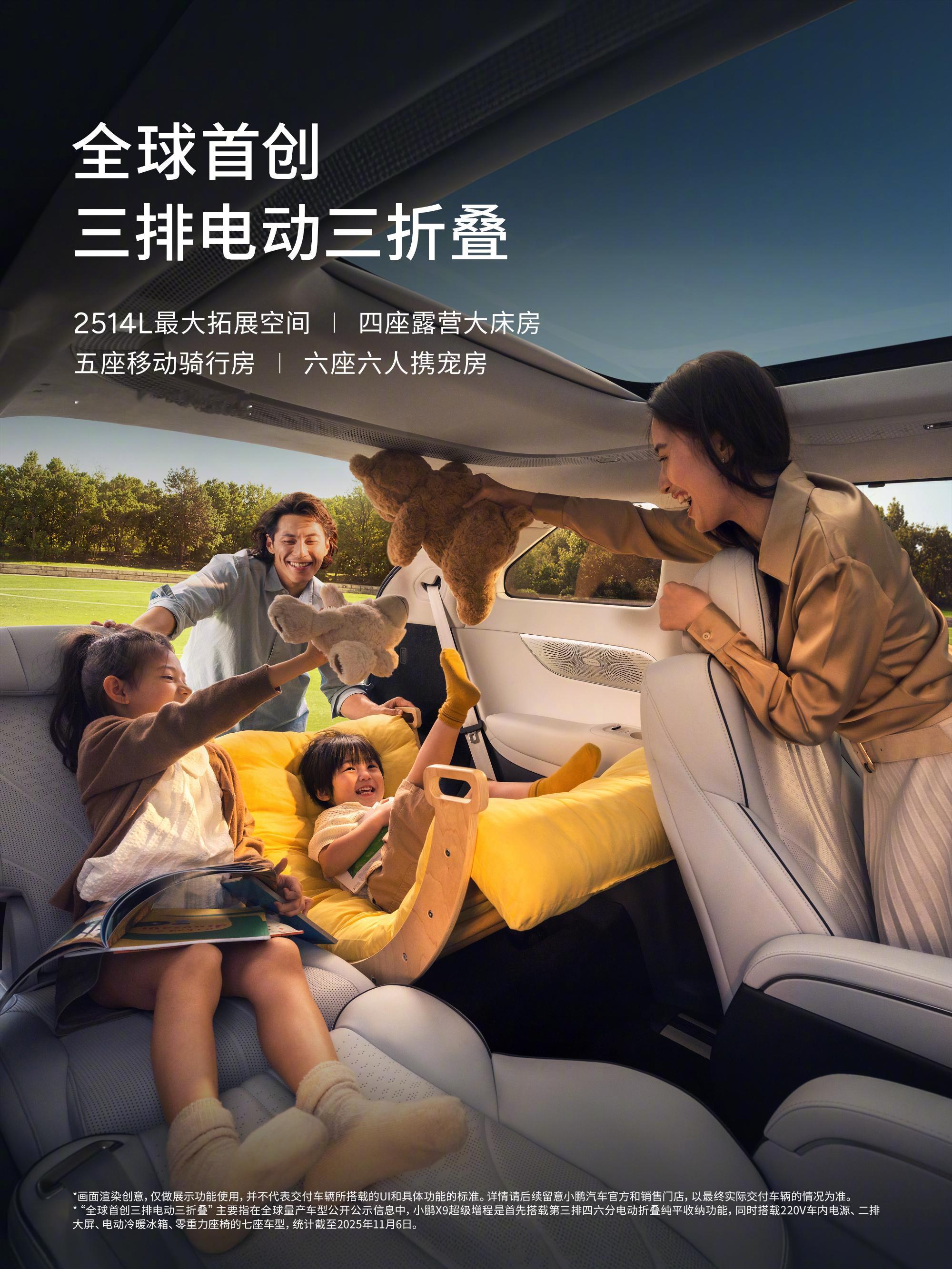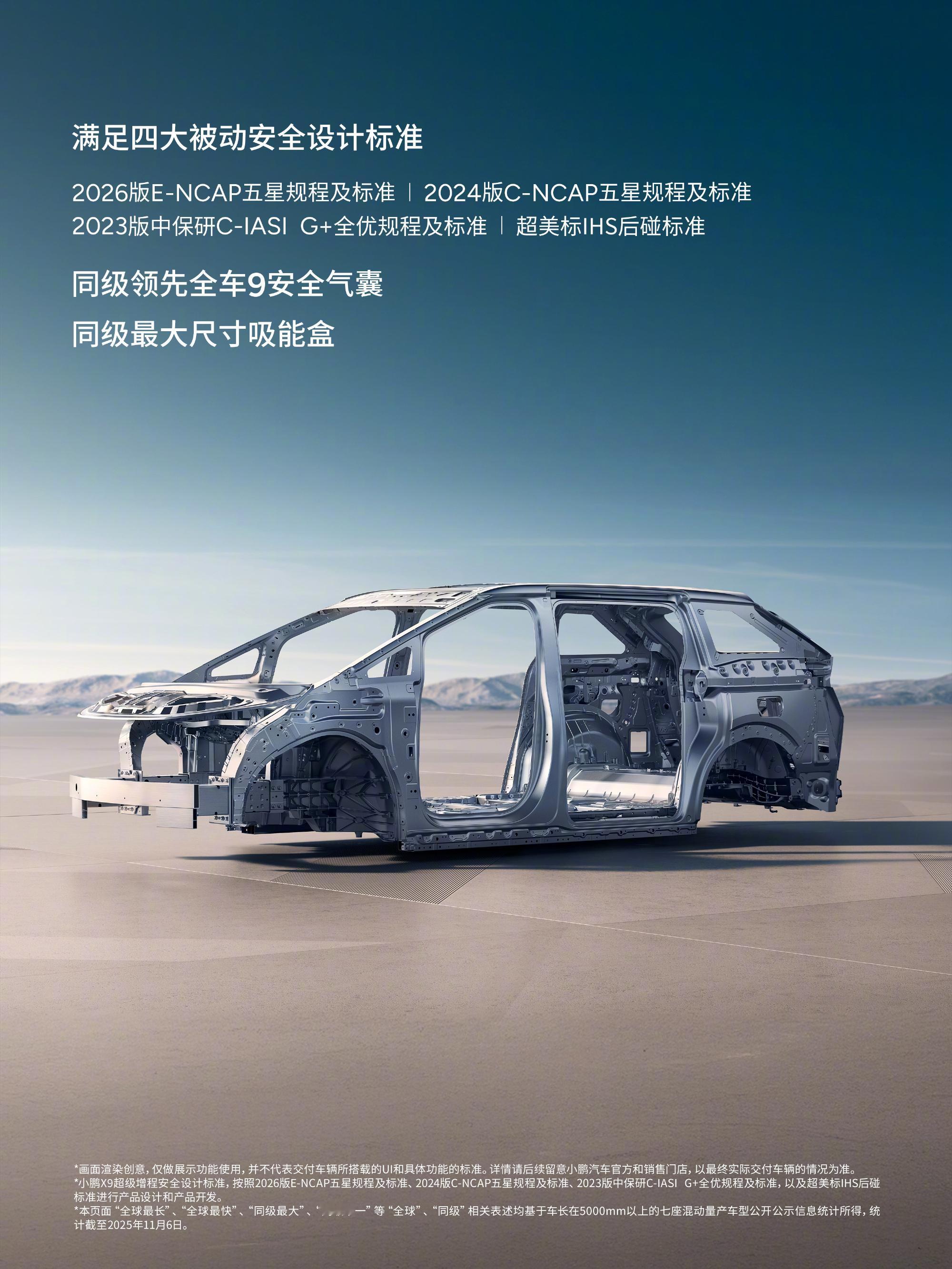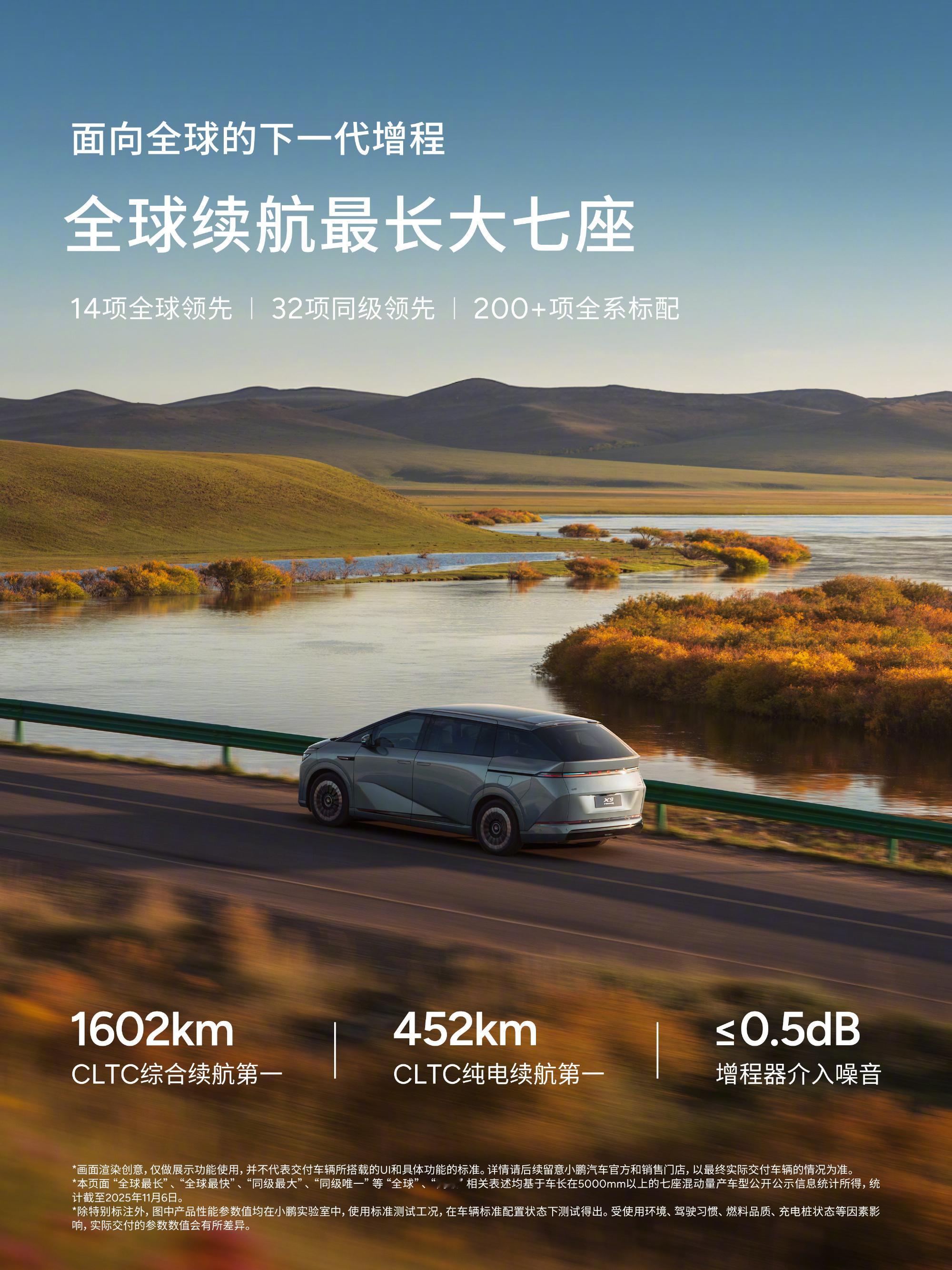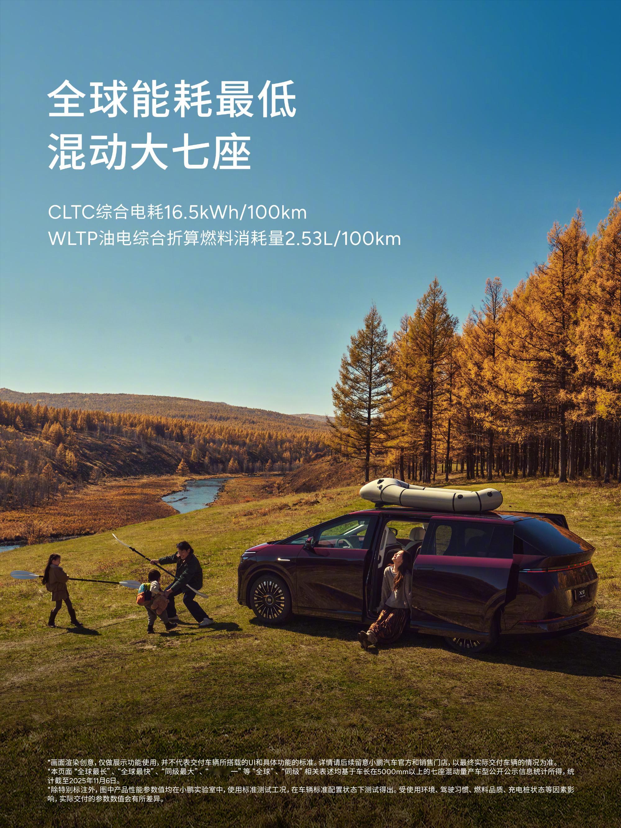 小鹏 X9 超级增程11 月 20 日正式上市!CLTC 纯电续航 452 公里,通勤一周充一次电就行,一年能省上万油费;再加上 60L 大油箱,综合续航冲到 1602 公里,从北京开到上海中途都不用补能,长途自驾别提多省心了。就算亏电状态,也能稳定 150km/h 巡航,2.53L 的超低综合油耗,能耗表现比同级车能打多了。补能速度更是惊喜,63.3kWh 超快充磷酸铁锂电池配 5C+800V 超充技术,10 分钟就能补 313 公里,12 分钟就能充到 70% 电量,比不少纯电车都快,吃顿饭的功夫就满电复活。而且不挑充电桩,还能加 92 号油,不管在城市里还是高速服务区,补能都不用费劲儿等。安全方面也拉满,同步满足中国和欧洲最高安全标准,有同级最大的前端吸能盒,还标配 9 个安全气囊。130km/h 能实现 AEB 紧急制动和 AES 紧急避让,还有冰雪稳行功能,就算遇到爆胎、高速施工或者抛锚车,也不会失控,不管什么路况都让人放心。空间布局特别灵活,靠着高利用率后桥设计,第三排能电动三折叠还能纯平收纳,能拓展出 2514L 的超大储物空间。不管是日常通勤、户外露营、骑行装备存放,还是多人出行,一键就能切换合适的布局,家用或者商务用都特别从容。现在上市发布会正在直播,想了解这款集超长续航、极速补能、全域安全、百变空间于一身的中大型 MPV,赶紧去看看,它是真的重新定义了增程出行的新标杆!