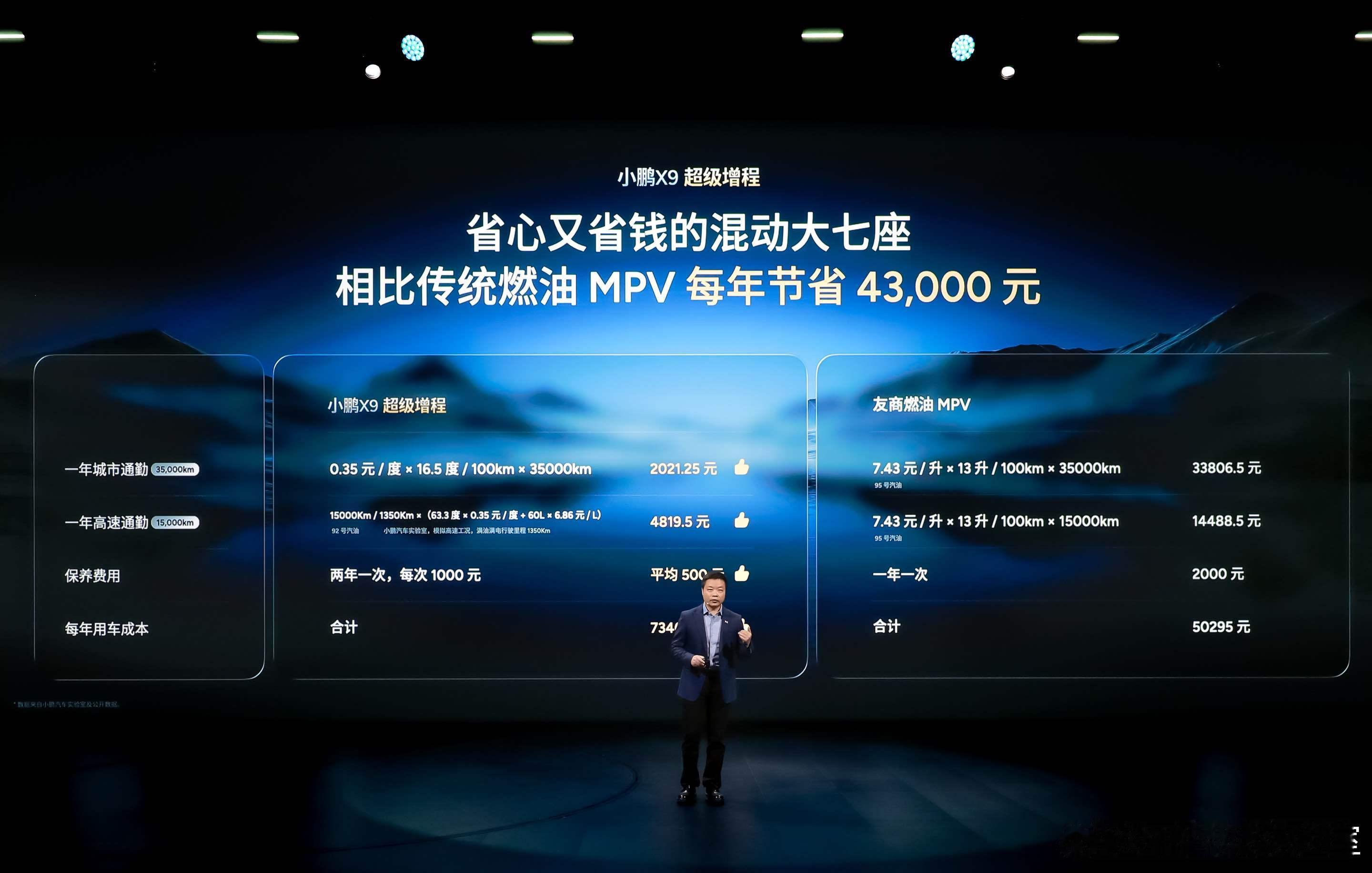 小鹏X9超级增程以“大油箱+大电池”的黄金组合,真正告别新能源续航焦虑。其搭载60L大油箱与63.3kWh大电池,1602kmCLTC综合续航全球第一,452km纯电续航可满足一周的日常通勤,实测满油满电可绕海南岛两圈,真实续航突破1200公里。在能耗方面,CLTC综合电耗仅16.5kWh/100km,WLTP油电综合油耗低至2.53L/100km,成就综合能耗最低大七座。更支持92号汽油,无惧偏远地区油品差异;相比传统燃油MPV年均节省约4.3万元,真正实现千里出行与全周期经济性的完美兼顾。