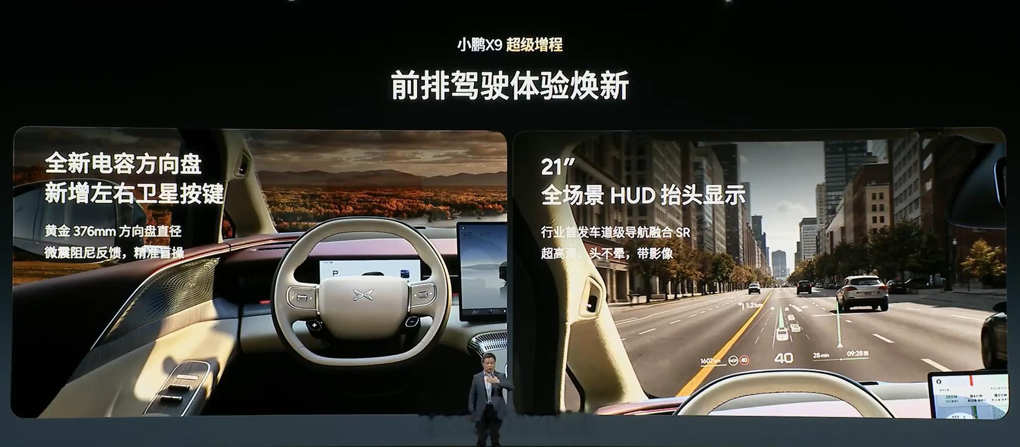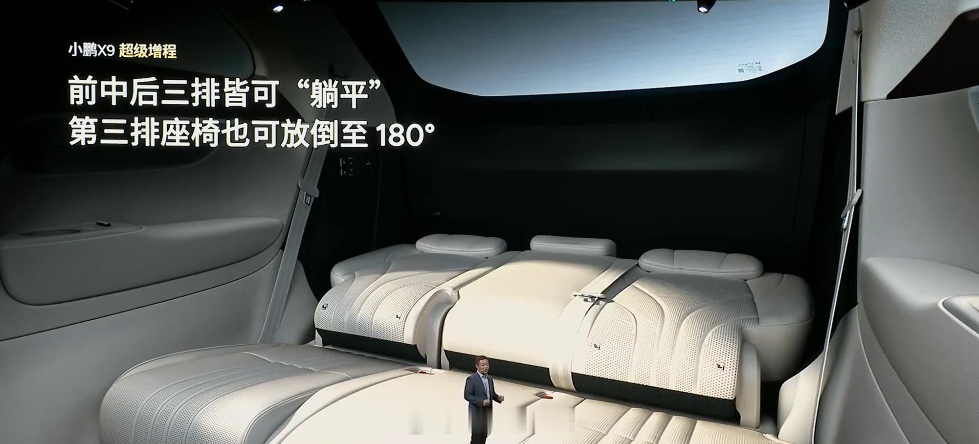 小鹏 X9 超级増程,前中后三排都可以躺平,第三排座椅也能放倒至 180°,全新电容方向盘新增左右卫星按键,还有 21 英寸全场景 HUD 抬头显示