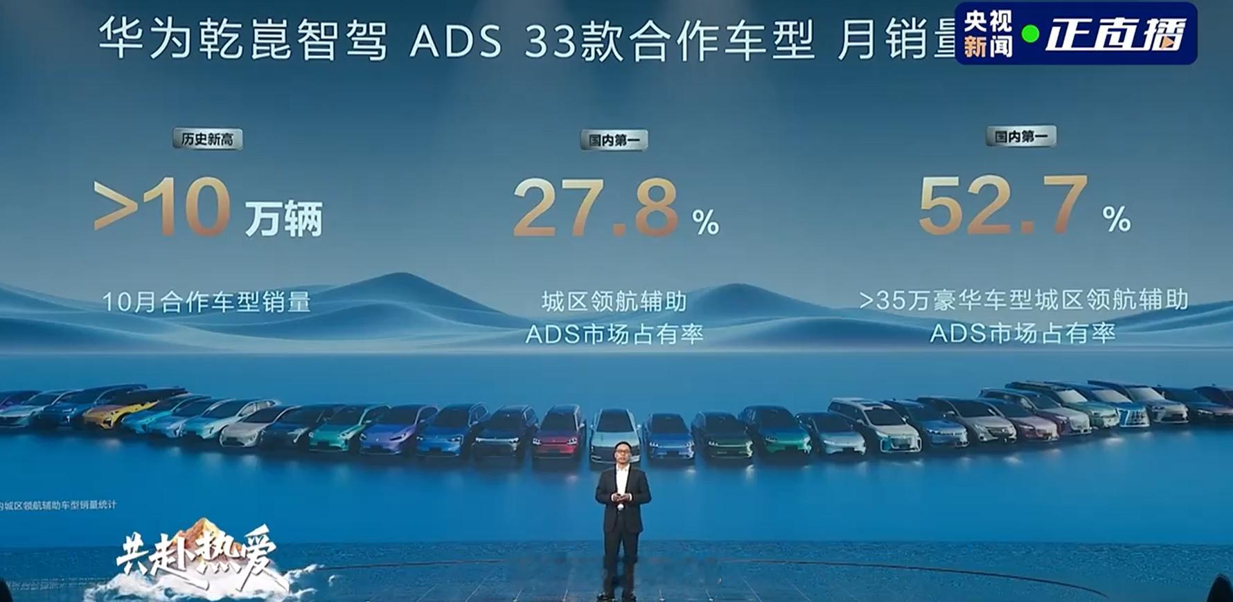 华为乾崑已经合作了 33 款车型,10 月销量突破 10 万辆,累计辅助驾驶里程数 58.1 亿公里,这数据很强了。