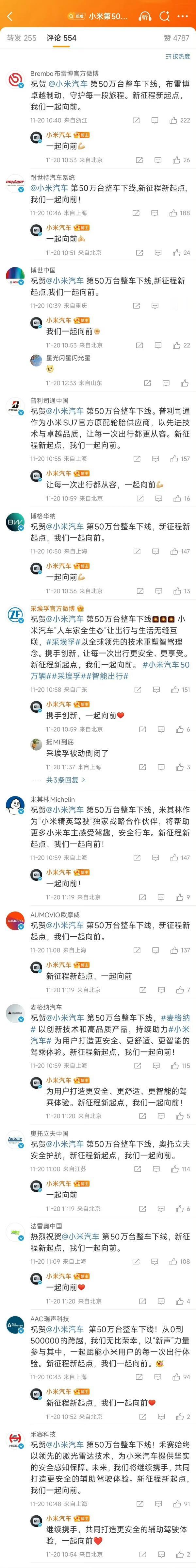 小米官宣第50万辆车下线!评论区全部都是各大国际供应商的留言! 随便都是国际大牌的供应商,小米汽车的热销也带火了,这些国际大品牌的持续热销,毕竟这些品牌就指望着中国汽车工业发展自己也能跟着喝汤。 不过也有比较好的事情是其中有几家是中国非常强劲的供应商,比如说禾赛科技,瑞声科技等等。 各位是怎么看的?欢迎评论区留言。
