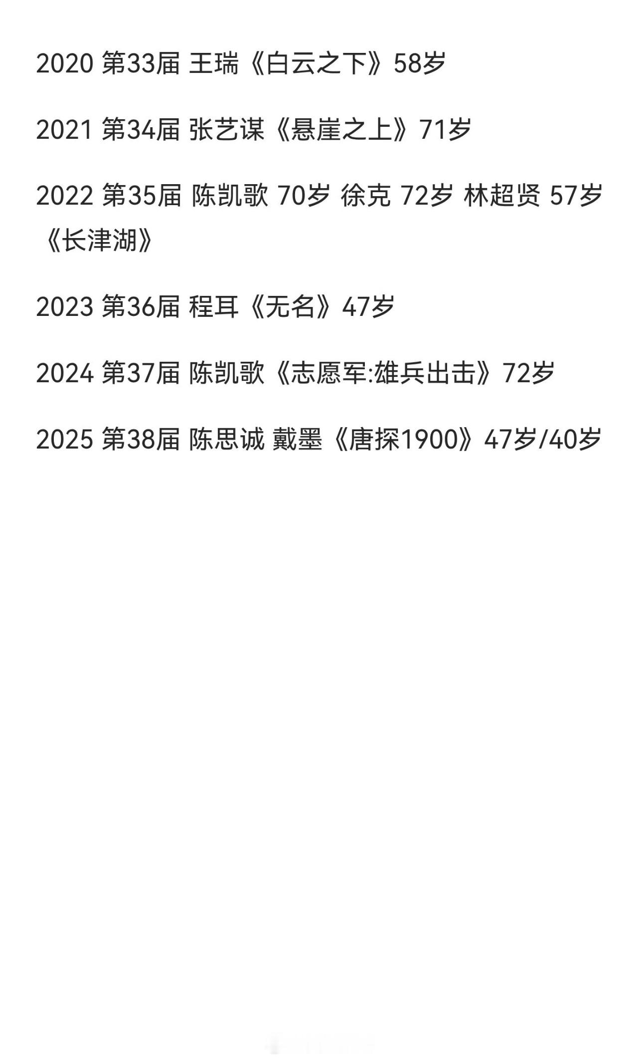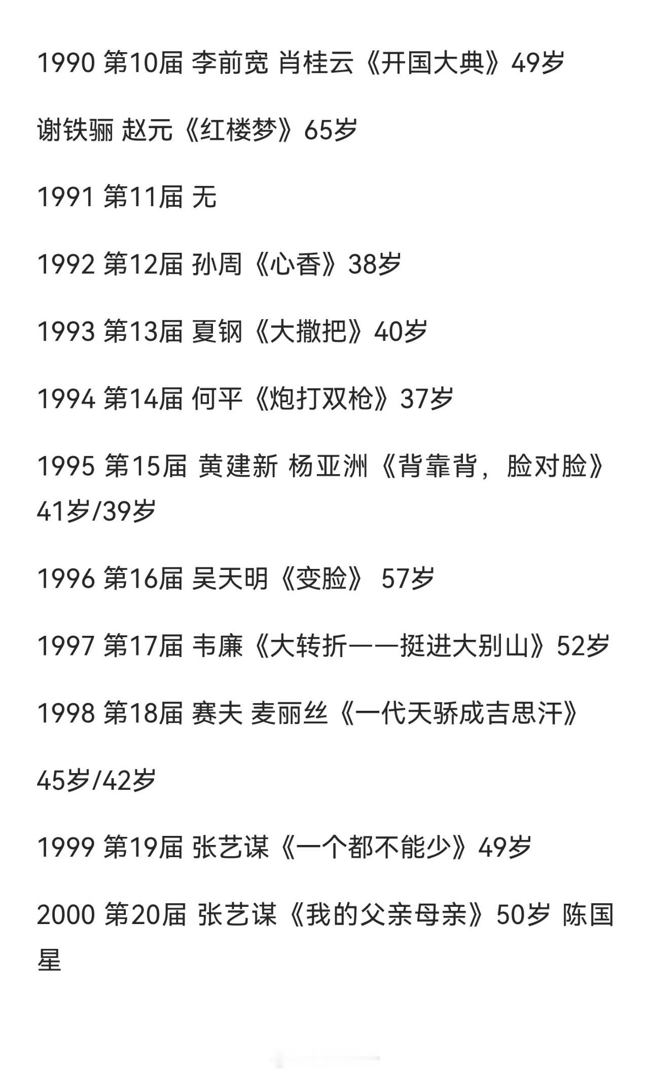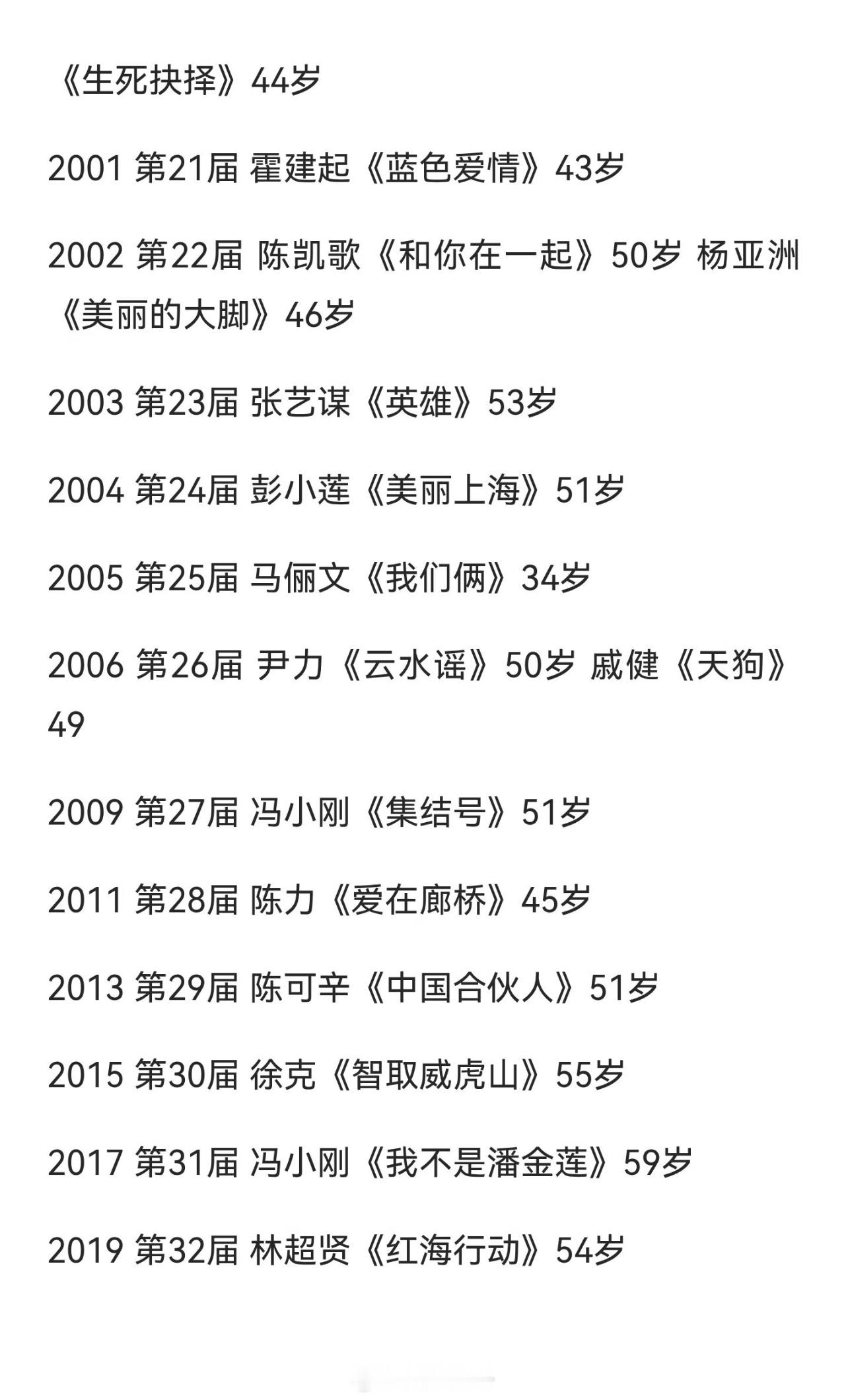 历届金鸡奖最佳导演获得者其中张艺谋四次获得最佳导演是唯一的第一人1999年《一个都不能少》2000年《我的父亲母亲》2003年《英雄》2021年《悬崖之上》四次拿下最佳导演奖其中陈凯歌三次获得最佳导演奖紧跟其后第二2002年《和你在一起》2022年《长津湖》(联合执导)2024年《志愿军:雄兵出击》其中获得两次最佳导演的六位徐克《智取威虎山》《长津湖》林超贤《红海行动》《长津湖》冯小刚《集结号》《我不是潘金莲》吴天明《老井》《变脸》杨亚洲《背靠背,脸对脸》《美丽的大脚》韦廉《大决战之辽沈战役》《大转折——挺进大别山》