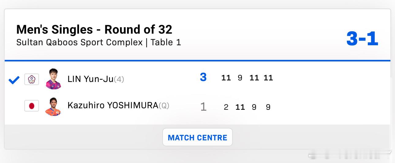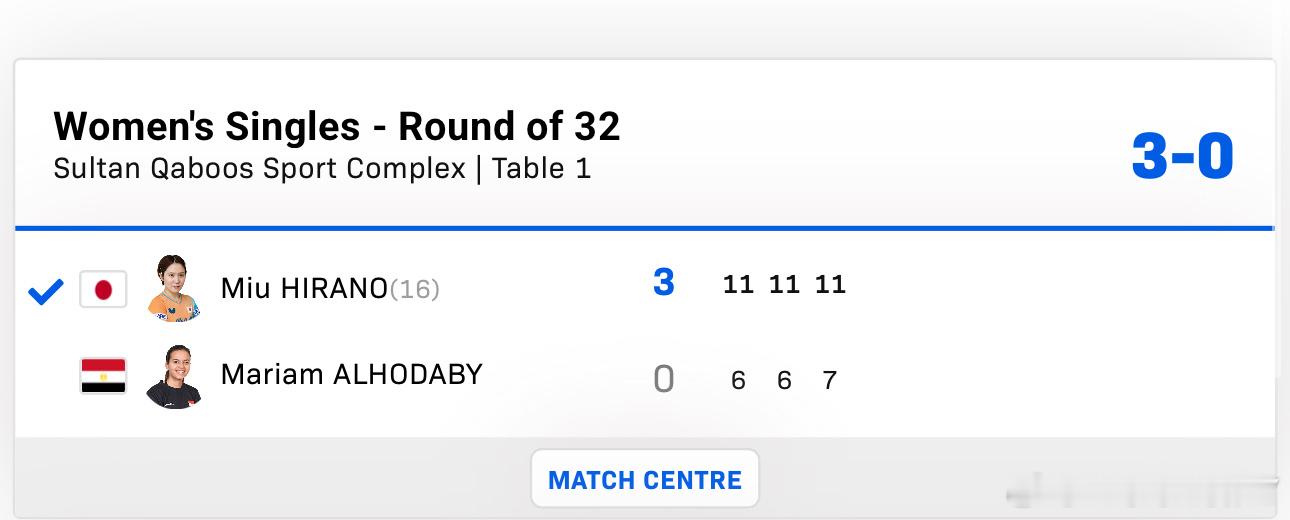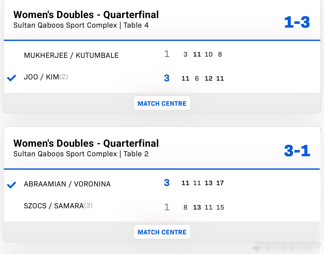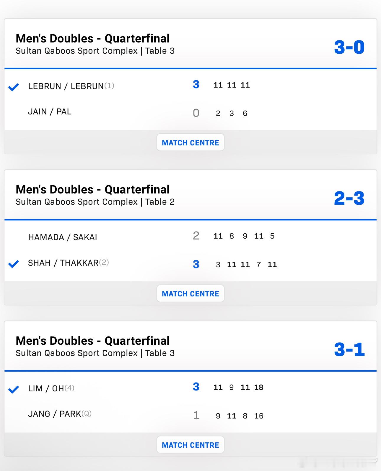 2025wtt马斯喀特球星赛男女子单打32-16林昀儒3-1吉村和弘平野美宇3-0玛利亚姆男子双打8-4勒布伦兄弟3-0帕亚斯/阿喀什玛努什/塔卡3-2坂井雄飞/滨田一辉林钟勋/吴晙诚3-1张禹珍/朴奎炫朱芊曦/金娜英3-1苏提尔塔/阿努沙阿尔巴米安/维罗妮娜3-1斯佐克斯/萨马拉