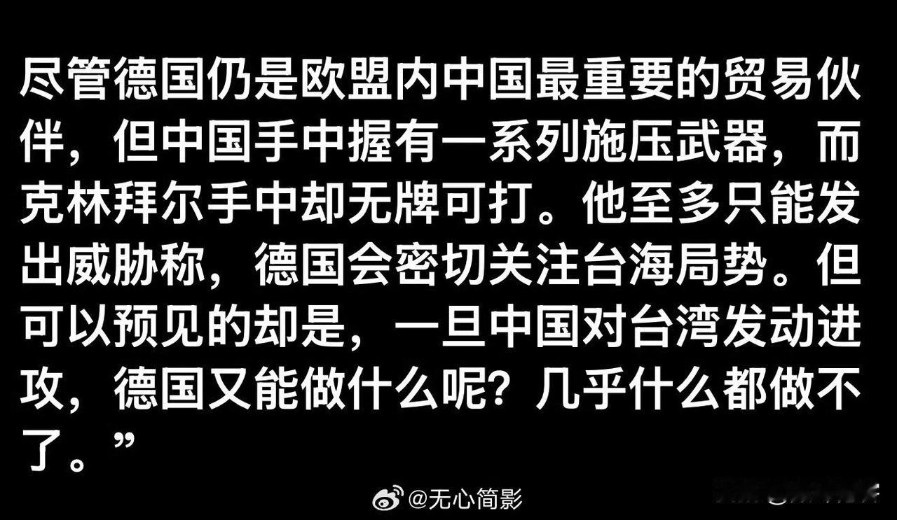 德国总是自以为是,你和中国好好做生意就好好做生意,却偏偏要和中国“打牌”? 要知道,德国和中国做生意,那是赚的盆满钵满,如果“打牌”那就要做对手了,我们信奉的是“人不犯我,我不犯人;你若犯我,我必犯人”,那就一定要打的你满地找牙! 不过,中国肚量很大的,只要你认输了,服气了,不再找茬犯贱了,又要想和中国好好做生意了,我们依然大人不计小人过,继续平视看待! 记住,西方那种咋咋呼呼,在中国人民面前不好使,根本不管用!朋友来了,有好酒;豺狼来了,有猎枪!