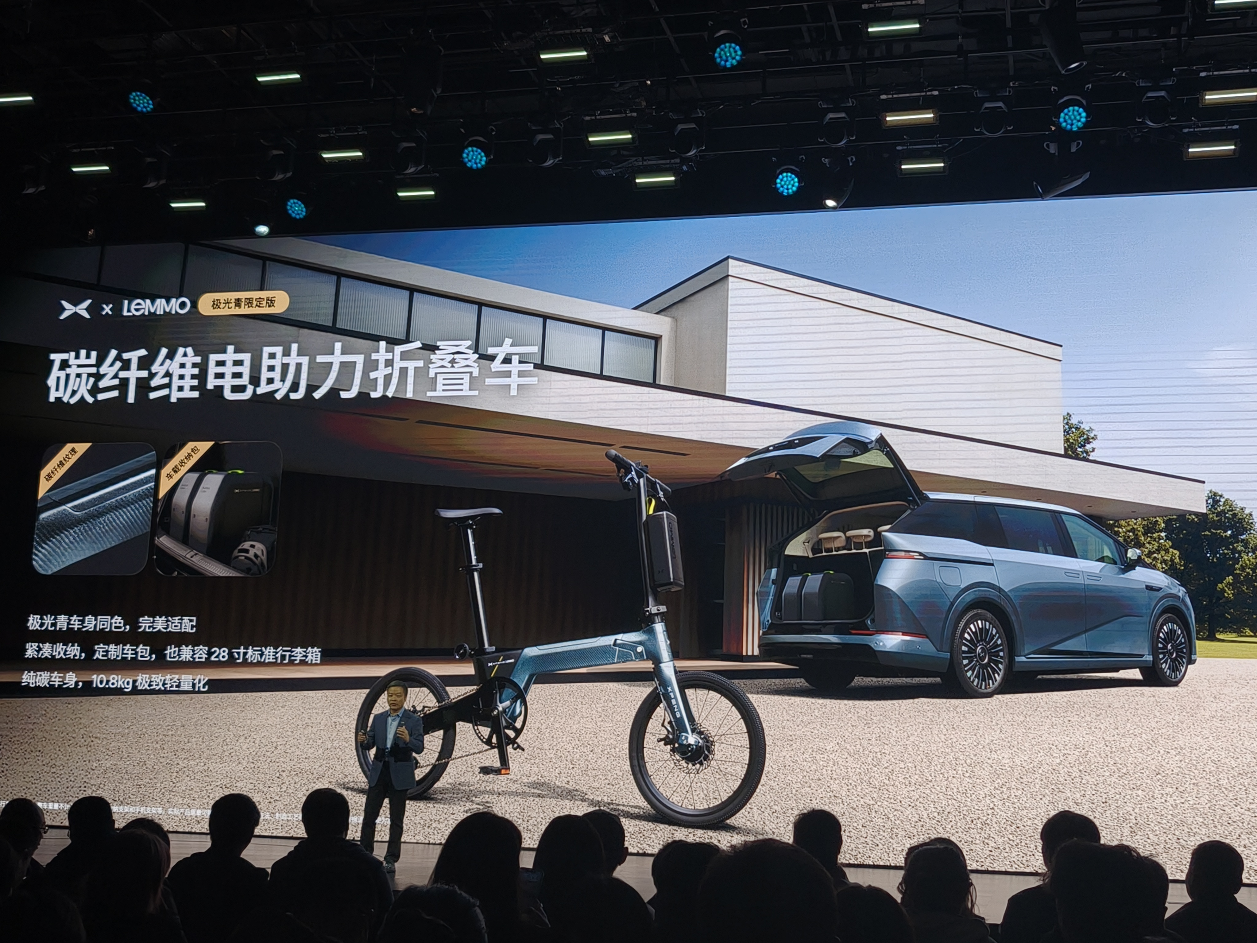 小鹏在今晚的发布会上,推出了一台联名款的碳纤维电助力折叠车,重量只有10.8KG,带有全套固定组件,可以直接放在小鹏X9超级增程后备箱里。