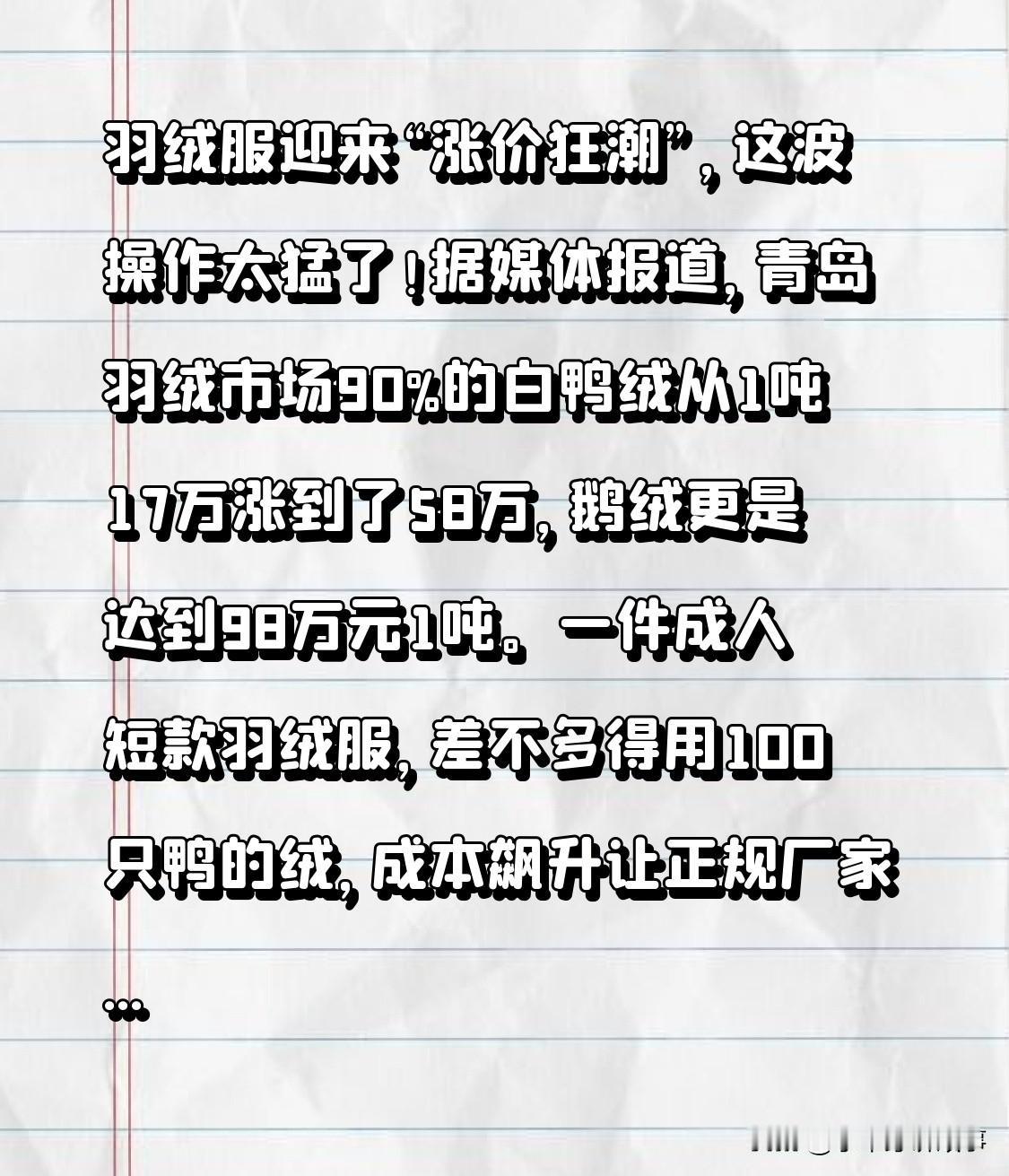 羽绒服掀起“涨价狂潮”,这波操作够猛!媒体报道,青岛羽绒市场90%白鸭绒从1吨17万涨至58万,鹅绒达98万元1吨。一件成人短款羽绒服约用100只鸭绒,成本飙升使正规厂家出厂价逼近千元。 商家称“真羽绒服不便宜”,400、500元难买好货,“真羽绒”起步价提到700元。涨价除需求旺季,还因猪肉价低,养殖户减产致鸭毛鹅毛减少。干洗店店主建议选黑、白等耐脏色。买羽绒服真肉疼!