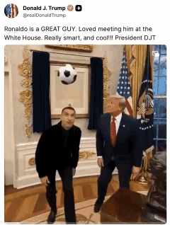 特朗普转发一段视频,视频中特朗普与C罗在白宫办公室共秀球技:颠球、盘带、射门,你来我往,相互传递,动作敏捷,配合密切。你可不要以为这是真的,这不过是一段AI视频而已,特朗普老小子借C罗到访白宫,衬托自己不但有一个年轻的心态,一副健康的体魄,而且还有一种不服输的精神。他的意思是说,奥巴马、拜登等民主党那帮对手,谁要不服,过来试试!