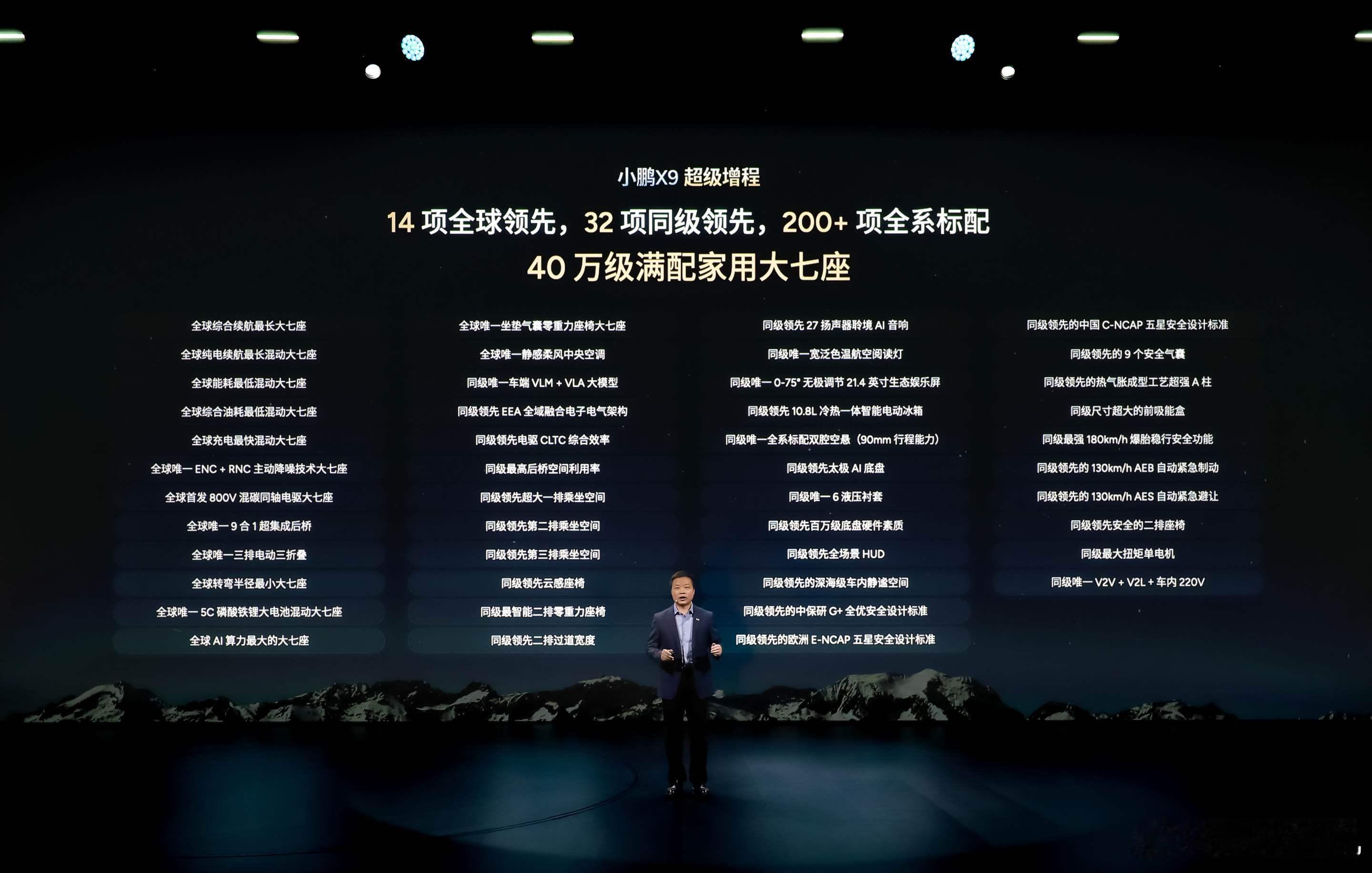 小鹏X9超级增程1602Max版上市价为30.98万元,1602Ultra版为32.98万元。小鹏X9超级增程以14项全球领先、32项同级领先、200+项全系标配的越级实力,打造40万级最满配家用大七座。- 全球续航最长大七座:综合续航1602km,纯电续航452km,实现"一周一充"日常通勤;配合800V 5C超充技术,10分钟即可补能80%,满足全家跨省出游需求。- 全球统一安全标准:同步满足中欧双五星安全标准,配备全球首个零重力座椅专属气囊,支持130km/h AEB+AES主动安全系统,具备全场景爆胎稳行与冰雪、脱困双模式能力。- 隔音媲美百万级好车:同级唯一搭载ENC+RNC双重主动降噪技术大七座,配合超静谧无感增程器与全车双层隔音玻璃设计,静谧性媲美百万级豪车,打造移动"隔音房"。- 豪华舒适与超大空间:全球首发三排电动三折叠,支持4-7座灵活变换,配合同级领先的第三排乘坐空间,实现从日常通勤到长途旅行的全场景空间自由。