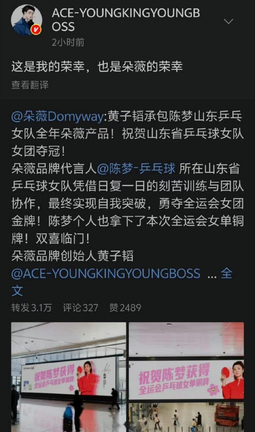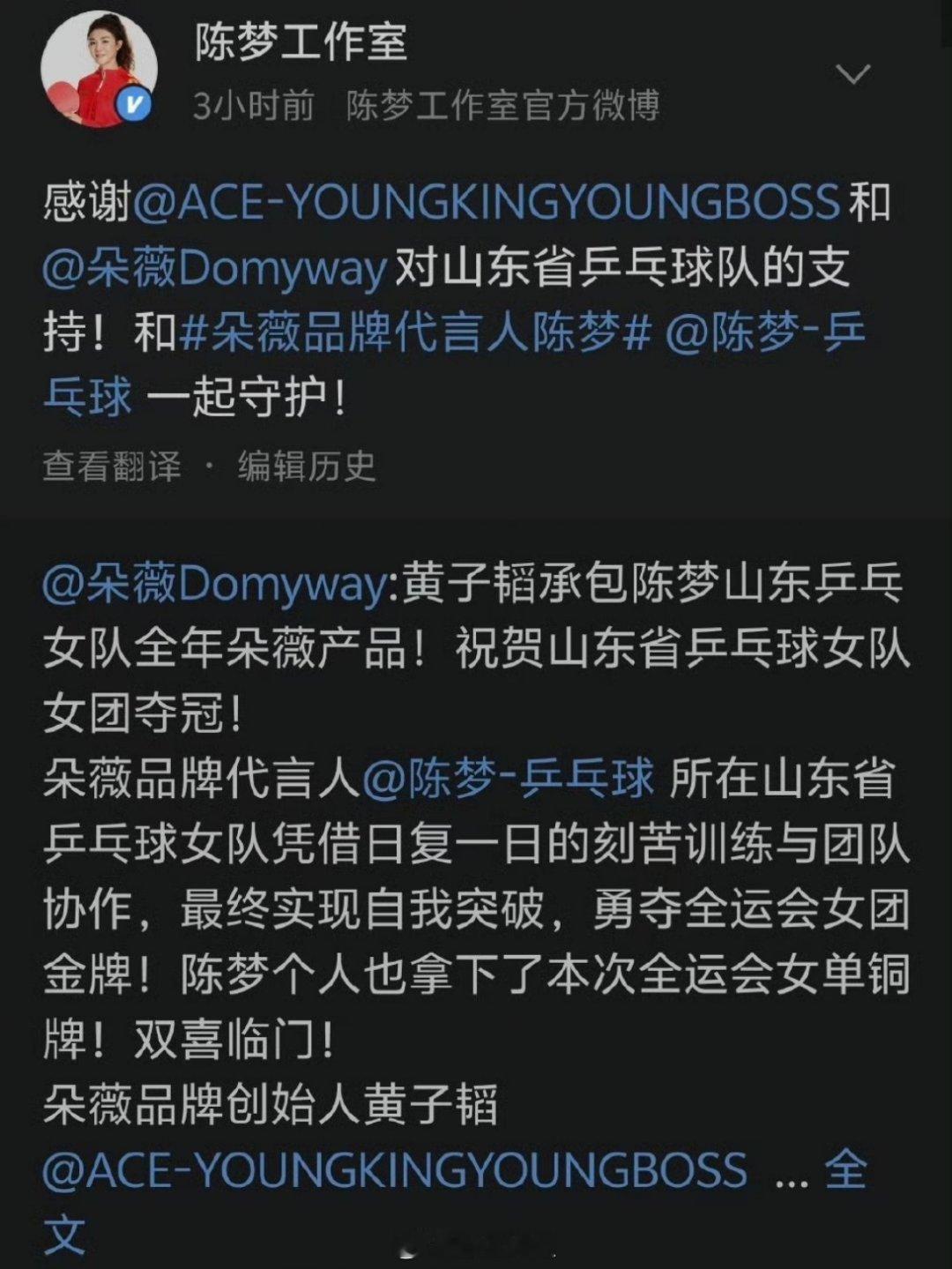 哇哦,居然看到了黄子韬跟陈梦的梦幻联动,黄子韬直接承包了陈梦所在的山东乒乓球女队全年朵薇产品,黄子韬这也是很豪爽了,是真的可以啊 ī ī