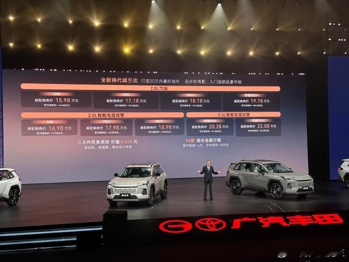 丰田全新威兰达正式发布,价格诚意满满 —— 燃油版 15.98 万起,电混双擎版 16.98 万起, 丰田全新威兰达 15.98 万起 直接拉低合资 SUV 购车门槛。这次新车亮点不少,把智能座舱、辅助驾驶等以往中高配才有的配置做成全系标配,真正实现 “入门就是豪华版”,再加上全系 1 万置换补贴,选择成本大幅降低。作为广丰首款采用域控架构的燃油车,它的智舱和智驾能力全面升级,油车用户也能体验到新一代智能车的便捷。动力上,第五代智能电混双擎延续了成熟稳定的优势,油耗更低、加速更顺,搭配可选四驱系统和耐造的底盘,均衡性依旧同级能打, 名副其实。这次车展上,全新威兰达还与纯电旗舰铂智 7 同台亮相,能看出丰田今年在新能源和智能化领域的全面发力