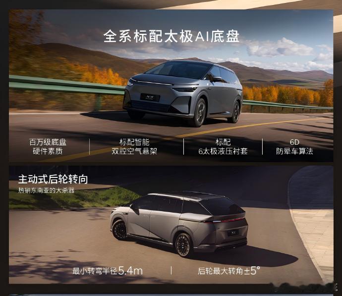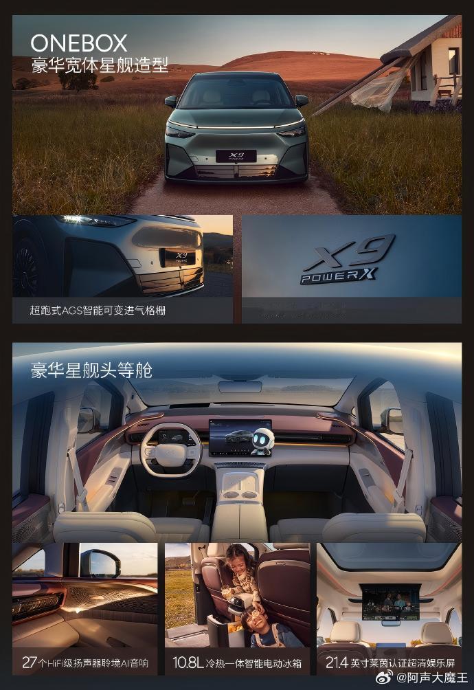 小鹏 X9 鲲鹏超级增程-1602 Max版——30.98万元 -1602 Ultra版——32.98万元-外观颜色:极光青 星舰灰 星云紫 暗夜黑 星云白 新月银-内饰主题:云间玫棕 月影咖 气宇灰-设计:ONEBOX 豪华宽体星舰造型 超跑式AGS智能可变进气格栅20英寸星耀悬浮轮毂+POWER X专属尾标+辅助驾驶小蓝灯-智能:最高搭载三颗图灵AI芯片+有效算力2250 TOPS VLM大模型-续航:1602km CLTC综合续航+452km CLTC纯电续航 ENC+RNC双重主动降噪技术标配超快充磷酸铁锂大电池+5C超充 CLTC综合电耗 16.5kWh/百公里-座椅:Nappa真皮座椅+14/12向座椅电动调节+SPA级10点加热+三档通风/加热安全气囊零重力座椅:腿托加热+坐垫安全气囊-安全:满足四大被动安全设计标准+全车9安全气囊-太极AI底盘:标配主动式后轮转向+智能双腔空气悬架-冰雪稳行系统:雪地模式+脱困模式