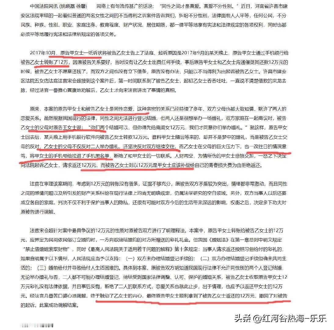 彩礼只会越来越高。 因为连女同性恋,都在要彩礼才能结婚。 像是这个法院的案件。 两个女生谈恋爱,然后要结婚了,一个就和另外一个要彩礼。 结果另外一个给了以后,那个女同性恋居然反悔了。 并且还不愿意退彩礼。。。 那这个事情男人忍不了,女同性恋也忍不了,彩礼给了不结婚这怎么可能。 居然就把那个女同性恋给告了。 告了以后,现在没有依据说是女同性之间也能给彩礼,所以其实这个钱是要不回来的。 但是呢,国内的法官还是比较认真,辛苦去和这个收了彩礼的女同性恋磨嘴皮,最后终于把这个12万的彩礼给要回来了。