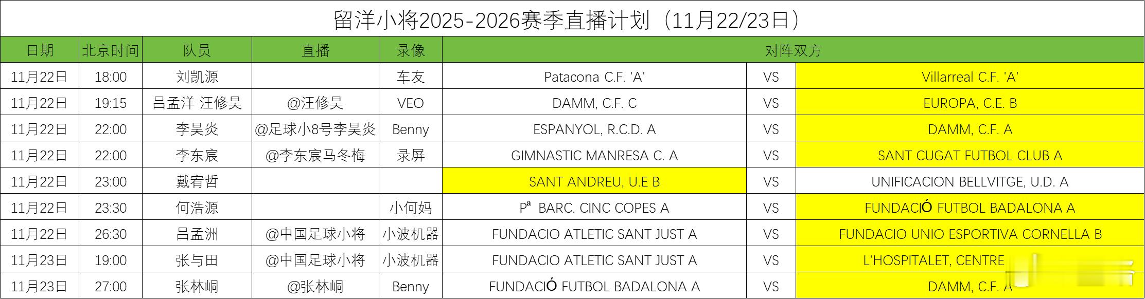 中国足球小将 留洋球员比赛直播计划。