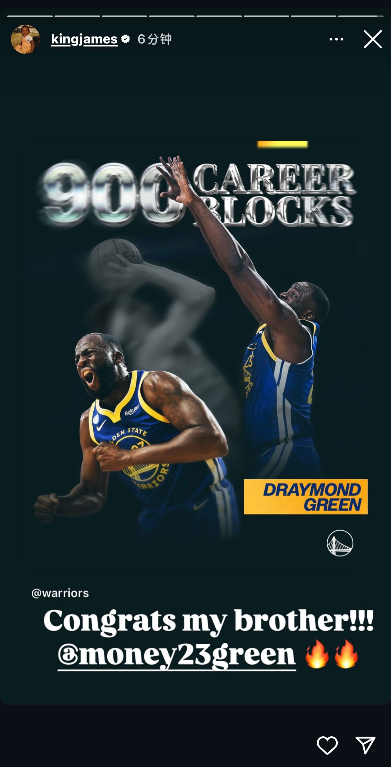 詹姆斯更新动态祝贺追梦格林生涯盖帽总数达到900次