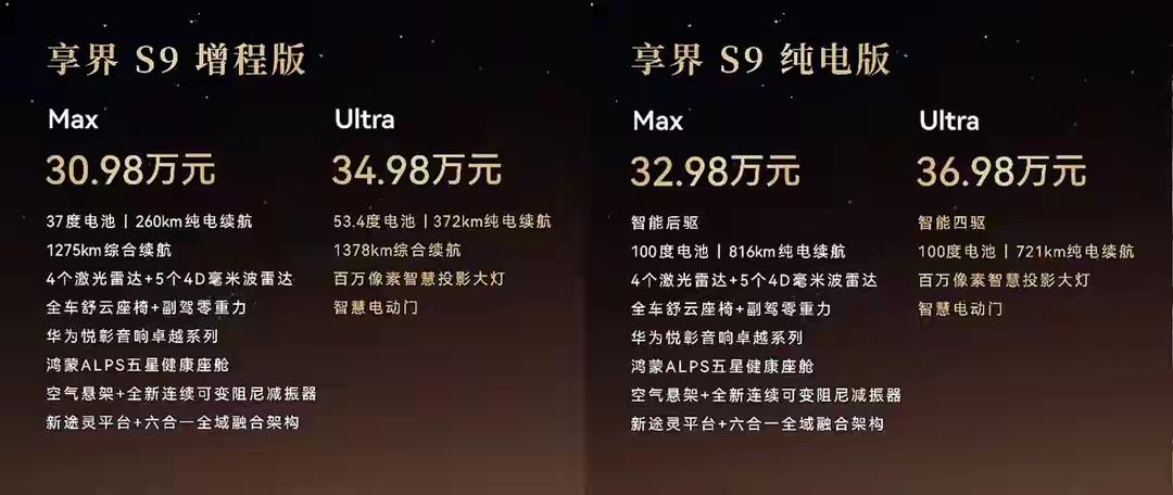 不管你信不信,这就是事实! 6月,享界S9卖了4215辆 7月,享界S9卖了1942辆 8月,享界S9卖了1841辆 9月,享界卖了1072辆 10月,享界卖了618辆 新款享界S9正式上市 享界S9是北汽和华为联合打造的享界品牌第一款车,定位为行政级豪华轿车,这款车售价30.98万元起,上市后一直不温不火。6月份销量达到4215辆,就当大家以为享界也要崛起的时候,随后几个月享界S9销量一路下滑,反而小众的旅行车享界S9T订单不错,目前已经超过3万辆。 刚刚,新款享界S9上市了虽然起售价没有变化,但是顶配足足降了8万元,新款有以下几个变化。 1:采用华为乾崑智驾ADS 4,新增了3分布式4D毫米波雷达矩阵,感知更精确,感应范围更大。 2:底盘采用新一代途灵平台和六合一全域融合架构,全系标配智能空气悬架与连续可变阻尼减振器,稳定性和舒适性进一步提高。 3:全系标配Nappa舒云座椅与12.3英寸副驾屏,9块双层PVB夹胶隔音玻璃等。 此外无论是车身颜色还是内饰颜色可选择性也很多了,新款性价比有所提高,预计月销量回到2000没有问题,加上享界S9T,享界月销量稳定在5000以上没有问题。