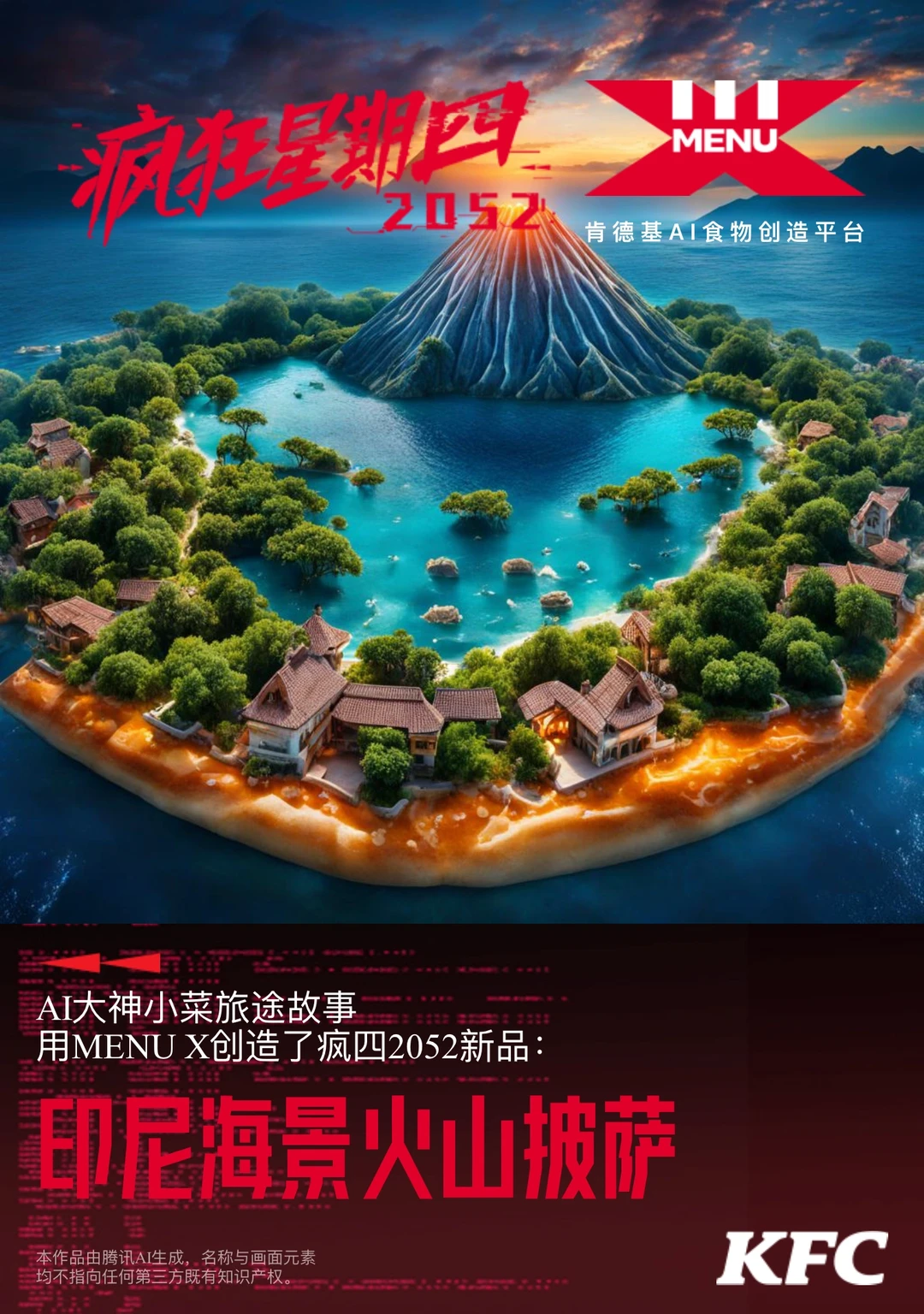 是我穿越了吗!🍟肯德基2052疯四菜单太酷炫了吧! 这些炫酷菜单全都是我用肯德基的AI食物创作平台MENU X创作的 😂v我50,来看看我DIY的2052疯四菜单😝 只需要在Menu X主页上输入3个关键词,就能把你的灵感变成创意美味! 简直是开启我另一个异世界之旅呀 异世界👉评论置顶 游走了呢么多地方的我,当然是要把所见所闻都融入到我的美食里 迪士尼魔法蛋筒、宇宙碰撞星蓝汉堡🍔、寒武纪冰川熔岩甜筒、侏罗纪恐龙披萨…..真的好想现在点单呀~~ 不知道能不能在肯德基2052年的疯四大饱口福! 今天开始异世界限时两周,快来打开脑洞,提前 28 年用Menu X创作你的2052疯四菜单! 据说每个人创作的脑洞美食图,都有机会在肯德基店里的点餐屏出现,肯求翻牌哈哈哈! 5月2号和5月9号部分肯德基门店从2052穿越而来,展示大家创作的2052疯四创意菜品,还有超炫酷员工服提前路透哦[暗中观察R]