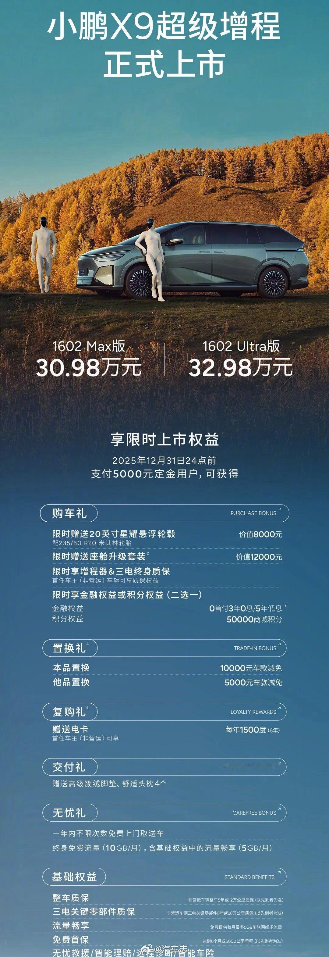 这价格太狠了,感觉会卖爆~一共两个配置!小鹏X9超级增程Max版30.98万,Ultra版32.98万🔥🔥