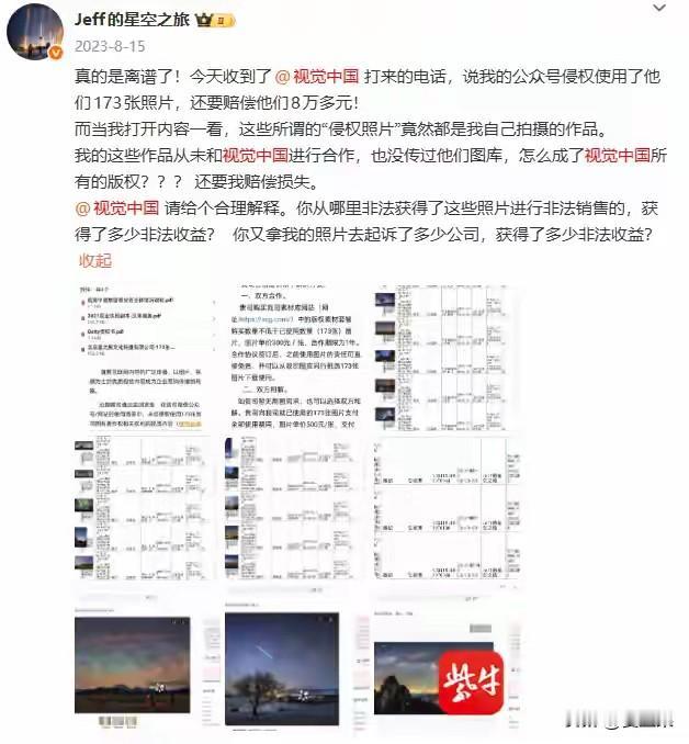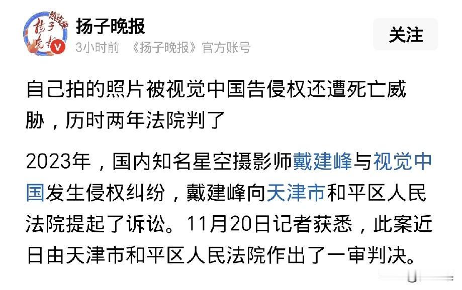 历时两年,著名星空摄影师戴建峰终于讨到了说法, 最近一审判决,网站“视觉中国”对戴建峰构成侵权,不仅要赔偿还要在官网上道歉。 事由发生在两年前,戴建峰突然接到“视觉中国”的电话,说他盗用他们173张图片,要求戴赔偿8万元。 戴建峰立即打开所谓的侵权内容查看,一看不要紧,气得鼻子都歪了, 这不是自己拍的照片吗?什么时候成视觉中国的了? 戴建峰被迫走上维权道路。 现在,案子终于尘埃落定,法院一审判决,确认“视觉中国”侵权。 据了解,视觉中国是由柴继军等人联合创办的视觉内容版权交易平台,其前身可追溯至2000年成立的“photocome”网站,2012年视觉中国集团正式组建, 2014年完成A股上市(上市公司名称:视觉(中国)文化发展股份有限公司)。 这个网站平台汇集了全球海量图片视频等素材,覆盖新闻、商业等多个领域,现在还配备了AI创意。 当然,素材基本上都是收费的,会员也仅仅只能免费得到三张带有水印的样图。
