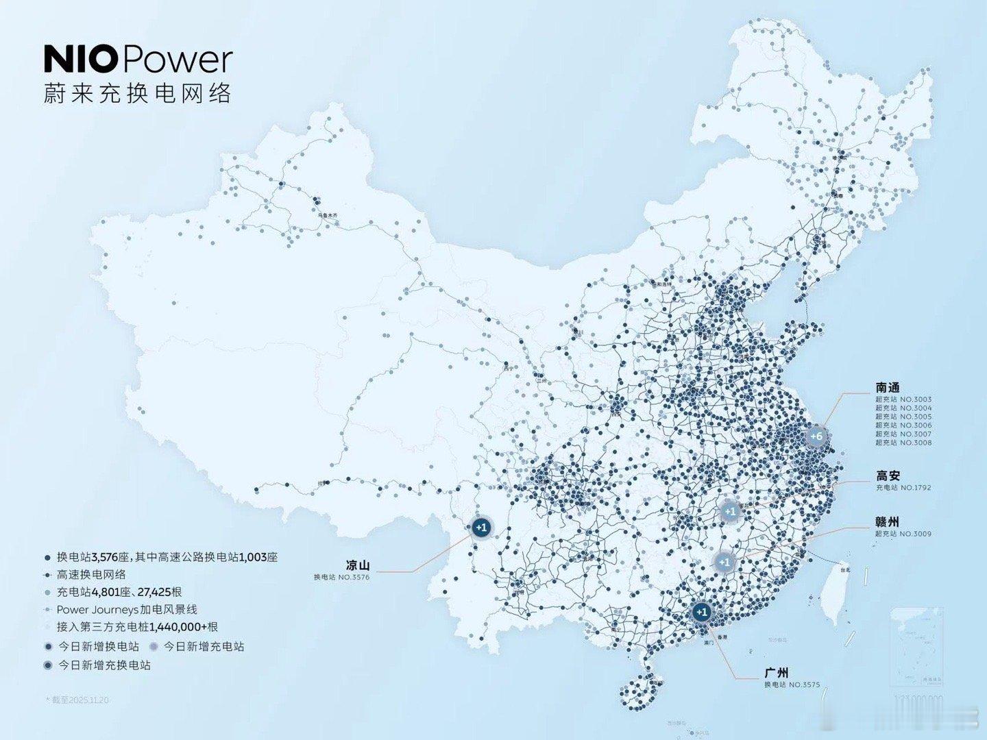 11月20日 NIO Power 10站上线NO.3575 蔚来换电站 | 广州白云龙归东NO.3576 蔚来换电站 | 凉山州盐源县泸沽湖NO.3003 蔚来超充站 | S28启扬高速袁庄服务区扬州方向2期NO.3004 蔚来超充站 | S28启扬高速袁庄服务区启东方向NO.3005 蔚来超充站 | S28启扬高速吕四港服务区扬州方向NO.3006 蔚来超充站 | S28启扬高速吕四港服务区启东方向NO.3007 蔚来超充站 | G15沈海高速苏通大桥服务区海口方向2期NO.3008 蔚来超充站 | G15沈海高速苏通大桥服务区沈阳方向2期NO.3009 蔚来超充站 | 赣州金星新村NO.1792 蔚来充电站 | 高安云丽酒店