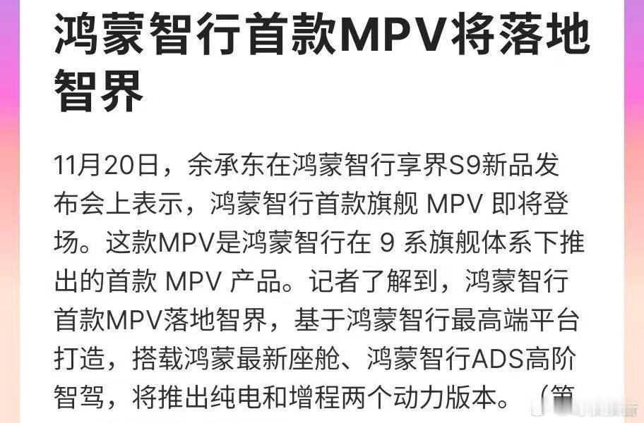 鸿蒙智行的车型版图一直缺一辆MPV,这事儿看来是由智界办了,市场需求肯定是拉满的,更值得关注的是智界一直都是鸿蒙首发产品的阵地,这次也更加坐实了智界“纯血鸿蒙”的位置。据悉,新车基于最高端平台打造,匹配鸿蒙最新座舱、ADS高阶智驾辅助、纯电增程双动力,都是国内高端新能源MPV中差异化的存在。问题来了,这车出来之后,谁最慌?