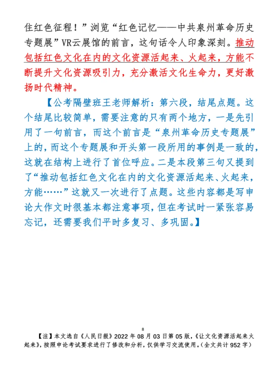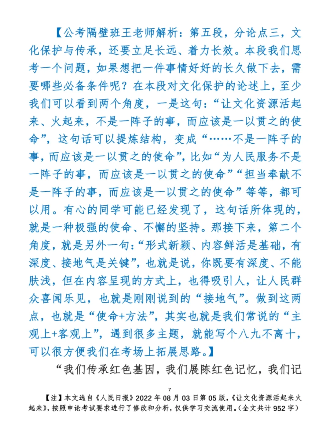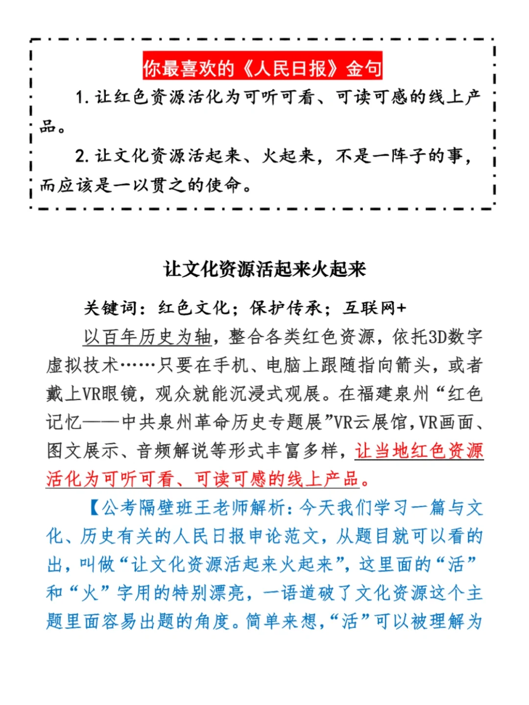 今日打卡作业: 1. 选一句你最喜欢的金句 2. 抄写全文红字+划线部分内容 3. 写完后在留言区打卡 ⭐️ ⭐️ ⭐️ ⭐️ ⭐️ ⭐️ 如何抄写:每天的抄写文章以图片形式发在“公考隔壁班王老师”账号,红色字是重点句和结构句,黑色字是正文,蓝色字是解析,大家抄写时不必抄蓝色字。建议先通读全文(包括蓝色解析部分),做到心中有数再开始抄写,效果会更好。 关于文章:抄写文章来源于人民日报,但每篇文章我都根据申论考试要求进行了修改,主要集中在四个方面:一是重写或修改开头、结尾;二是统一段首句句式结构;三是调整段落字数,使文章结构更均衡;四是简化复杂长难句,使之更具可模仿性。每篇文章修改幅度不同,无论修改多少,都是基于申论考试要求,毫无对人民日报文章品评之意。(此处致敬人民日报) 关于解析:我会在文章每段后面加一段蓝色字的解析,是我自己在抄写时的感悟,篇幅时间有限,不能面面俱到,但求重点突出。如果你有其他感悟,也希望能在评论里分享,我们相互学习、共同进步。 ⭐️ ⭐️ ⭐️ ⭐️ ⭐️ ⭐️ 这里是公考隔壁班王老师独创的“每天半小时・申论80分”抄写团,欢迎加入我们!