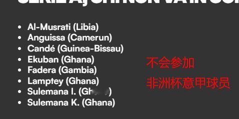 【非洲杯】非洲杯12月21号开幕-2026年1月18号决赛,意甲可能参加非洲杯的球员(图1),不会参加非洲杯的意甲球员(图2),安古伊萨比较特殊,喀麦隆进入非洲杯,但是他的伤病据说1月才康复基本铁定错过。