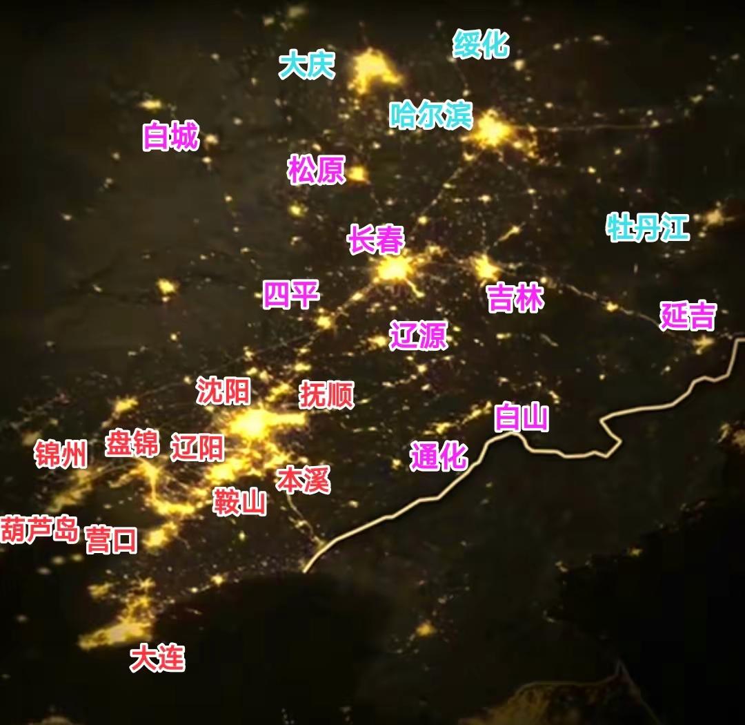 看东北部分城市繁华程度。大庆与哈尔滨的灯光面积大小差不多,从这个细节可以看出大庆的化工厂占地面积还是很庞大的。 此外大家会发现沈阳、抚顺、辽阳、鞍山、本溪这几个城市的夜晚灯光已经完全连成片,从这个细节可以看出沈阳都市圈是东北地区最热闹的地方。 同时也能看出吉林省的城市虽然是繁华区域面积普遍很小,可是通化与白山之间的距离真的很近,因此我认为这两个城市要加强合作才能做大做强,希望今后能越来越好。