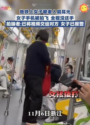 11月6日傍晚,浙江杭州地铁车厢内发生一起冲突。一名年轻女子坐下休息时,身旁老人要求让座未果。老人突然挥手扇其耳光,女子手机飞出撞在车壁上摔碎。老人继续拉扯对方,女子保持沉默未还手。警察到场后将老人带走,女子报警并录口供。 现场有乘客全程录视频,可见老人情绪激动。事后女子浑身发抖,表示没想到会遭袭。网友大多谴责老人行为,认为“年龄不是犯错借口”。警方已立案调查,具体处理结果尚未公布。