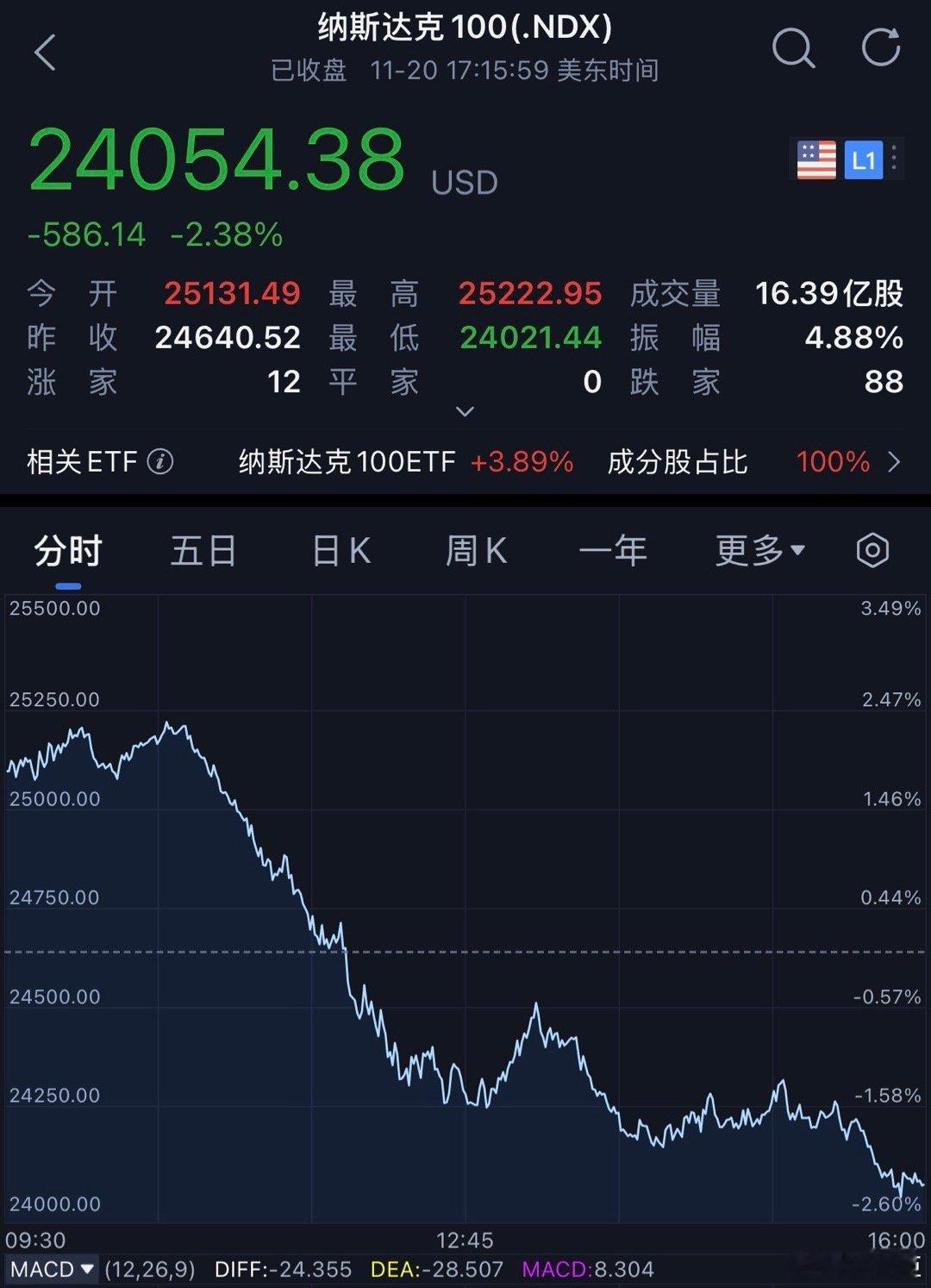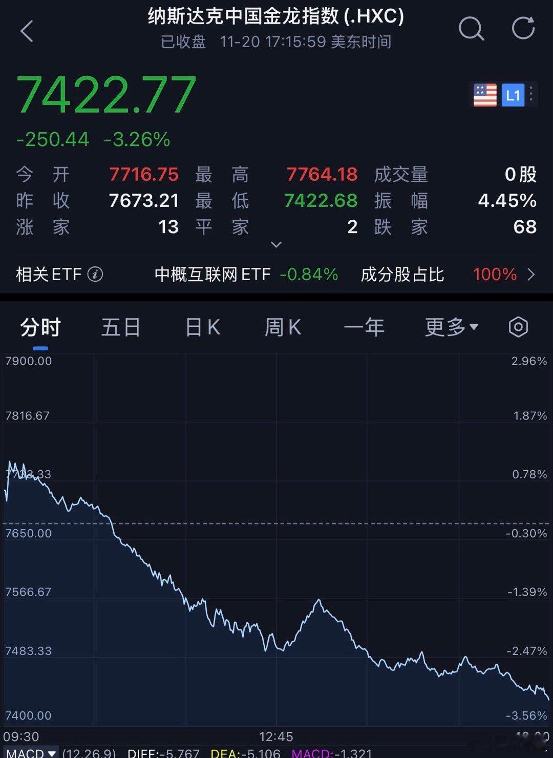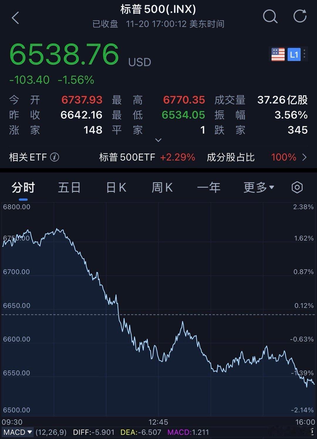 老板们早安,打卡养铁咯在英伟达超预期财报刺激下,隔夜美股三大指数集体大幅高开,纳指盘初一度大涨2.58%,但随后画风突变,三大指数大幅跳水,纳指大跌超2%,日内最大跌幅超1100点。美股大型科技股全线下跌,甲骨文暴跌超6%;美股半导体板块亦集体重挫,费城半导体指数大超近5%。截至收盘,道指跌0.84%,标普500指数跌1.56%,纳指大跌2.15%。热门中概股普跌,纳斯达克中国金龙指数收跌3.26%。国际金价走平。
