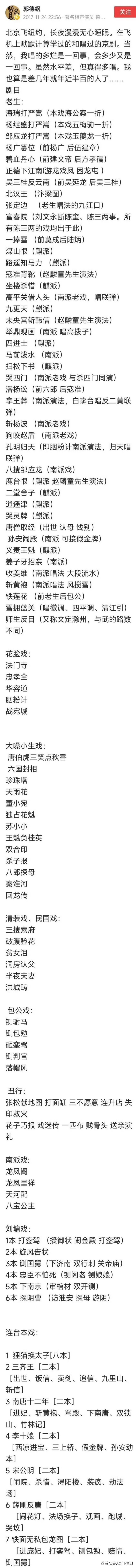 老郭究竟会多少出京剧? 早在2017年11月,德云班主郭德纲发文,列出自己学过