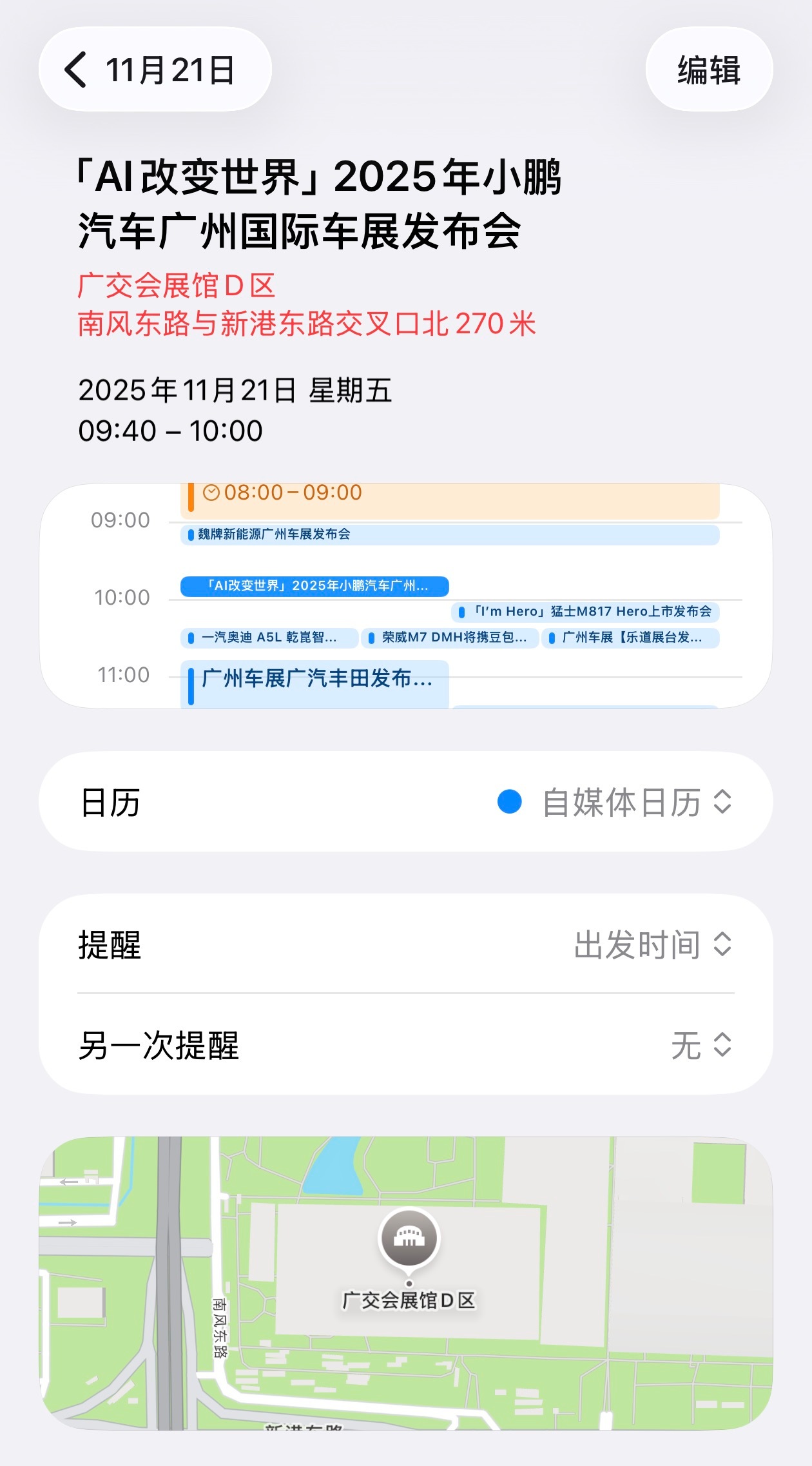 早,今天广州车展媒体日。iPhone的日历真好用,不同的车在不同的展馆,这样添
