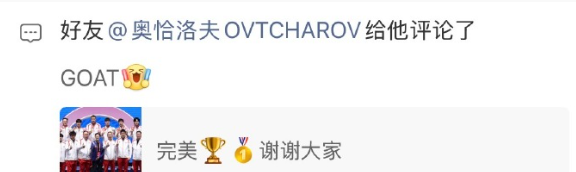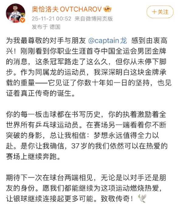 11月21日,奥恰洛夫发文:为我最尊敬的对手与朋友马龙感到由衷高兴!刚刚看到你职业生涯首夺中国全运会男团金牌的消息,这条冠军路走了这么久,但你从未停下脚步。作为同属龙的运动员,我深深明白这块金牌承载的重量——它见证了你数十年如一日的坚持,也见证着真正传奇的诞生。