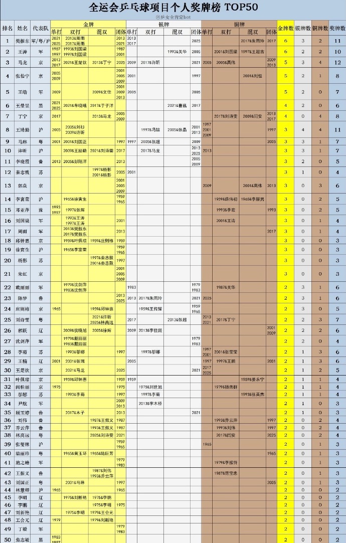 樊振东全运会奖牌榜第一 恭喜樊振东在第十五届全运会中十战十胜!樊振东成功卫冕男子单打金牌🥇 同时带领上海队进入决赛,勇得团体银牌🥈!樊振东以奖牌总数11,6枚金牌位于第一!