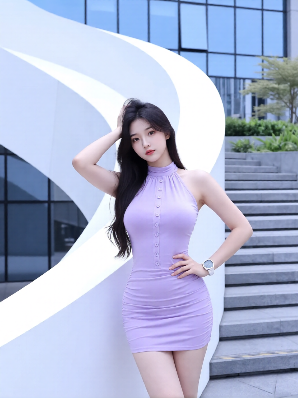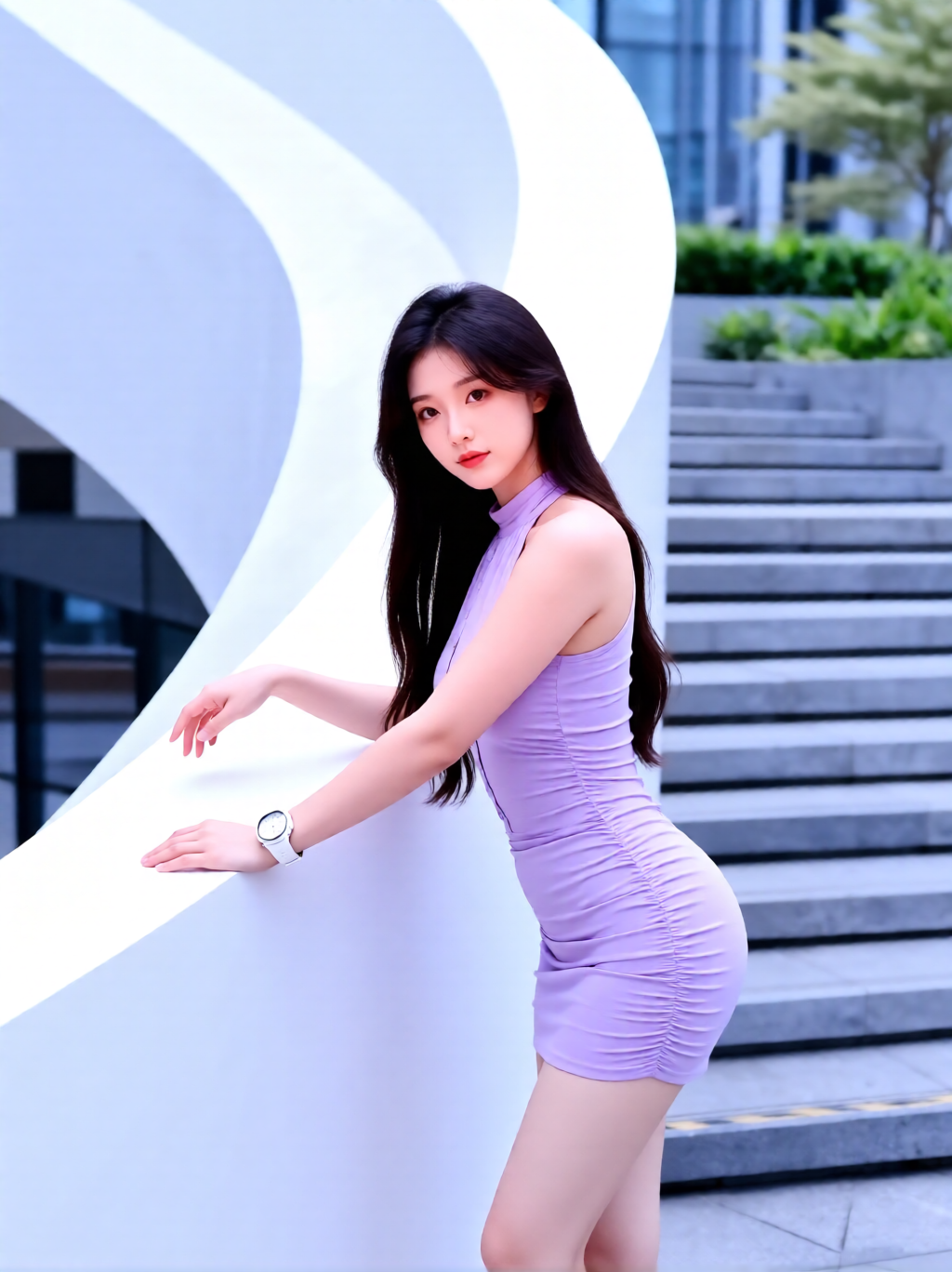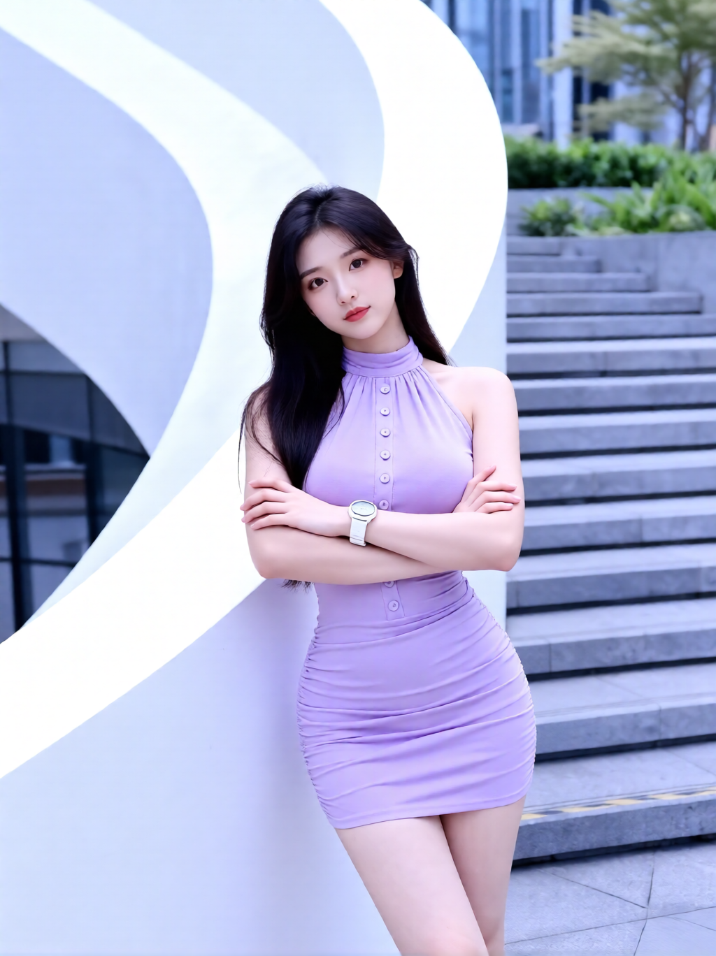 都市时尚少女,紫色连衣裙,优雅气质,都市风范。