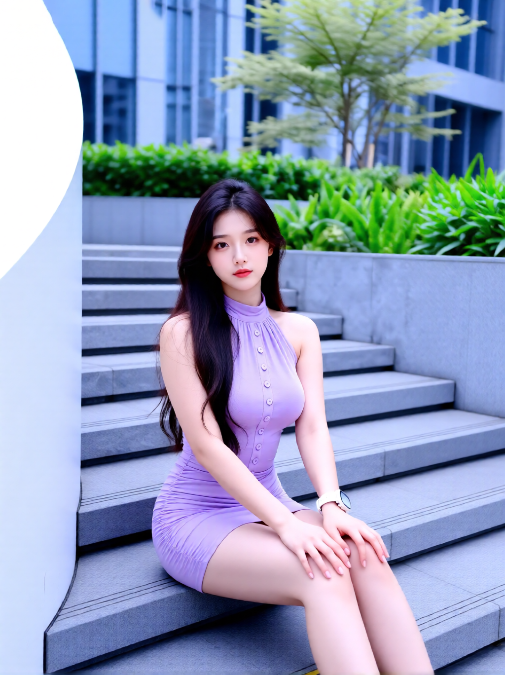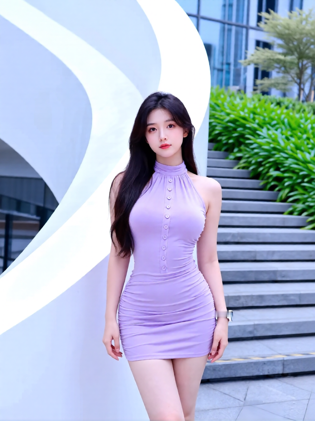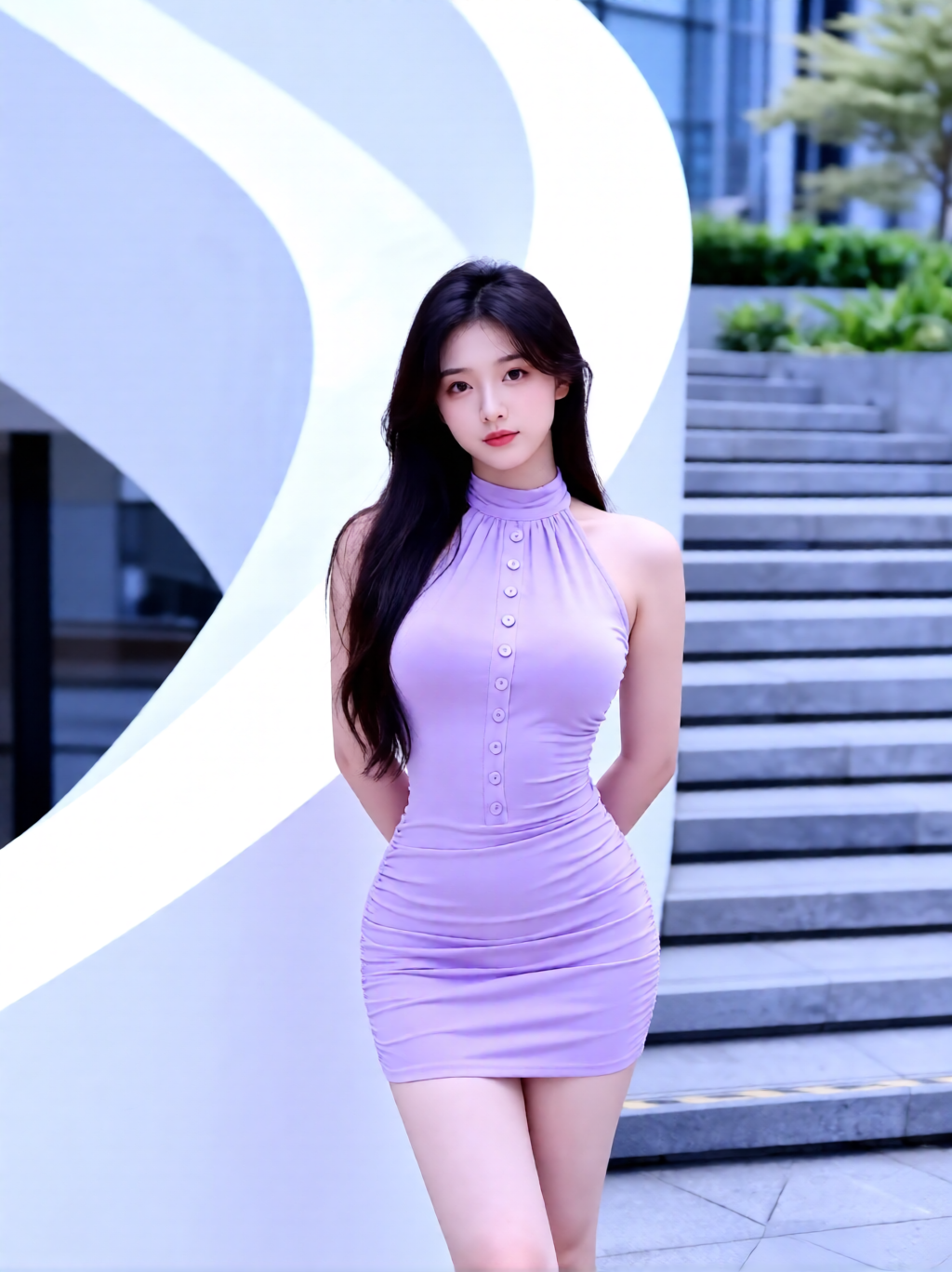 都市时尚少女,紫色连衣裙,优雅气质,都市风范。
