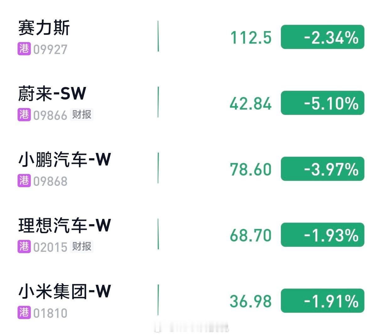 咋回事,港股的赛力斯 蔚来 小鹏 理想 小米 5个新能源汽车品牌,全部跌