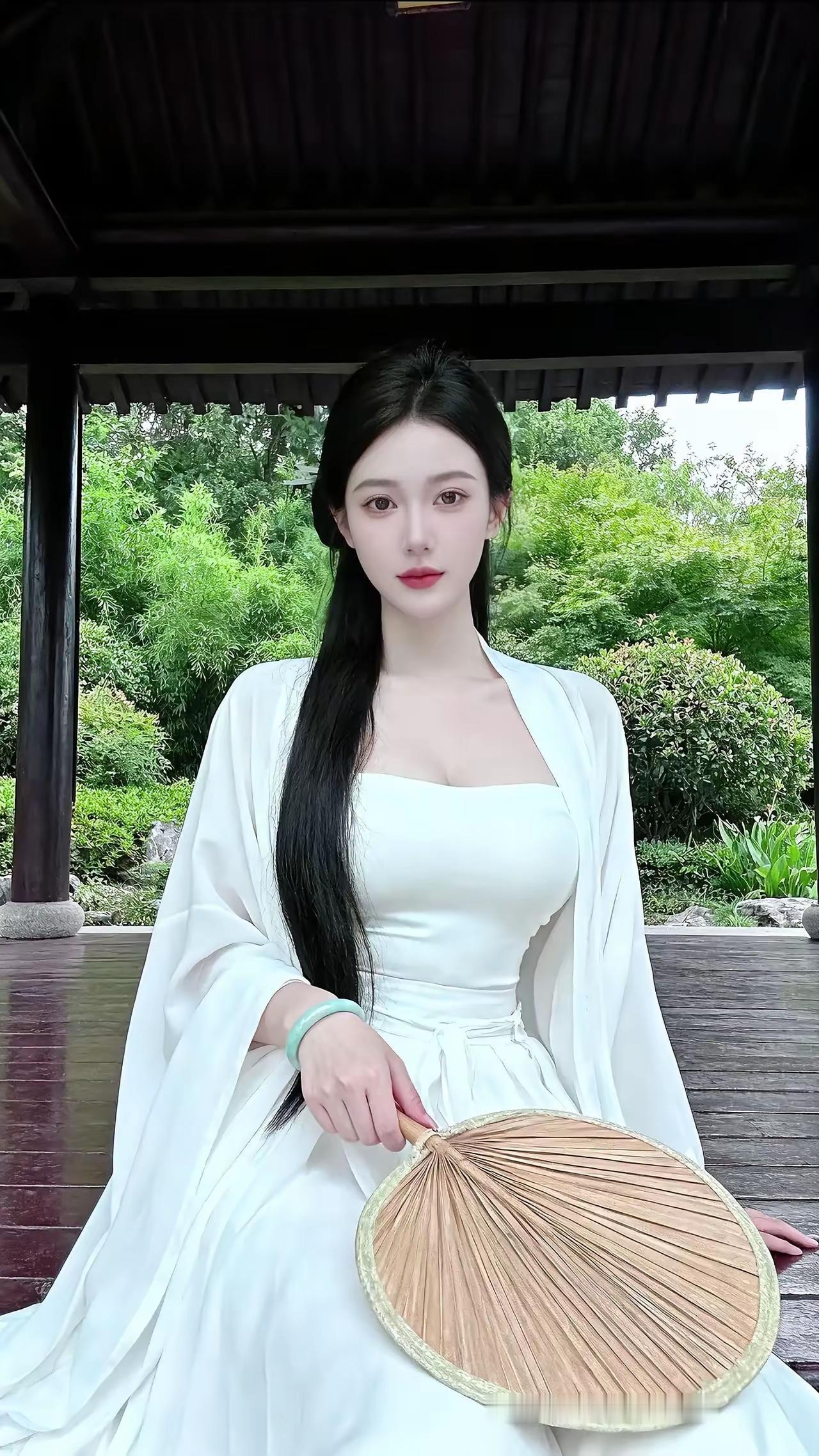 古风少女,手持团扇,静坐庭院,宛如画中人。