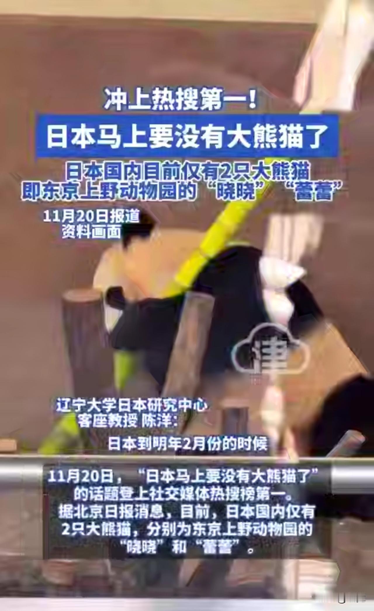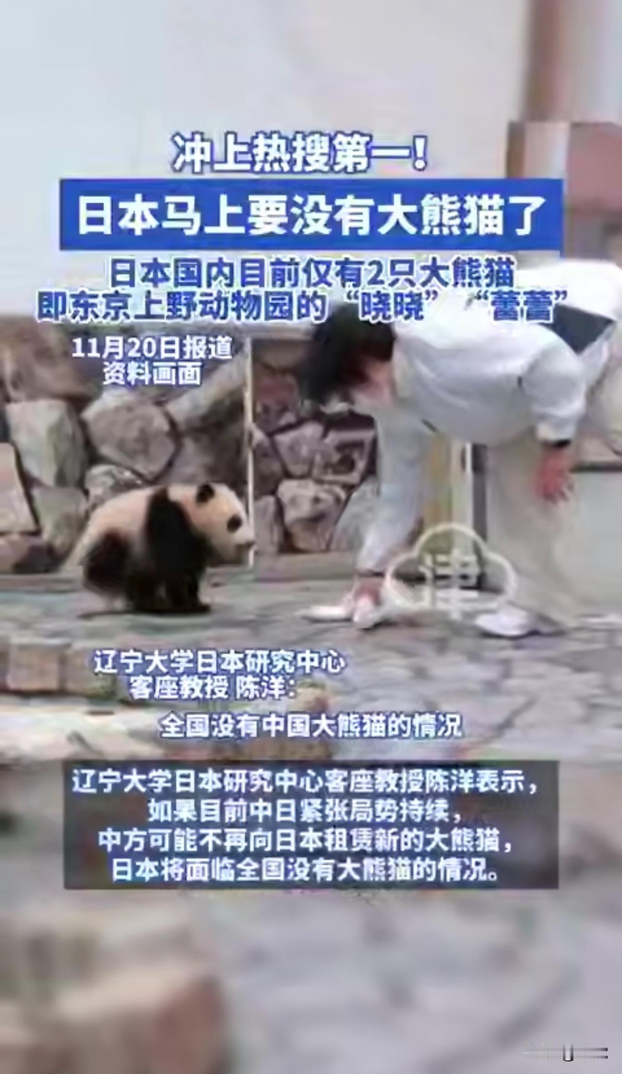 11月20日,多家媒体报道: 日本或将进入“无熊猫时代” 目前日本仅剩的两只大熊猫“晓晓”和“蕾蕾” 已确定将在明年2月归国 因租赁期满 中方决定不再续租 早前在外交部记者会上 日媒记者透露了这项安排 随着中日关系持续恶化 有关人士警告称 如果日方依旧不思悔改 中方可能不再向日本租赁新的大熊猫 届时日本境内将不再拥有任何大熊猫 不知道岛国人民怎么想