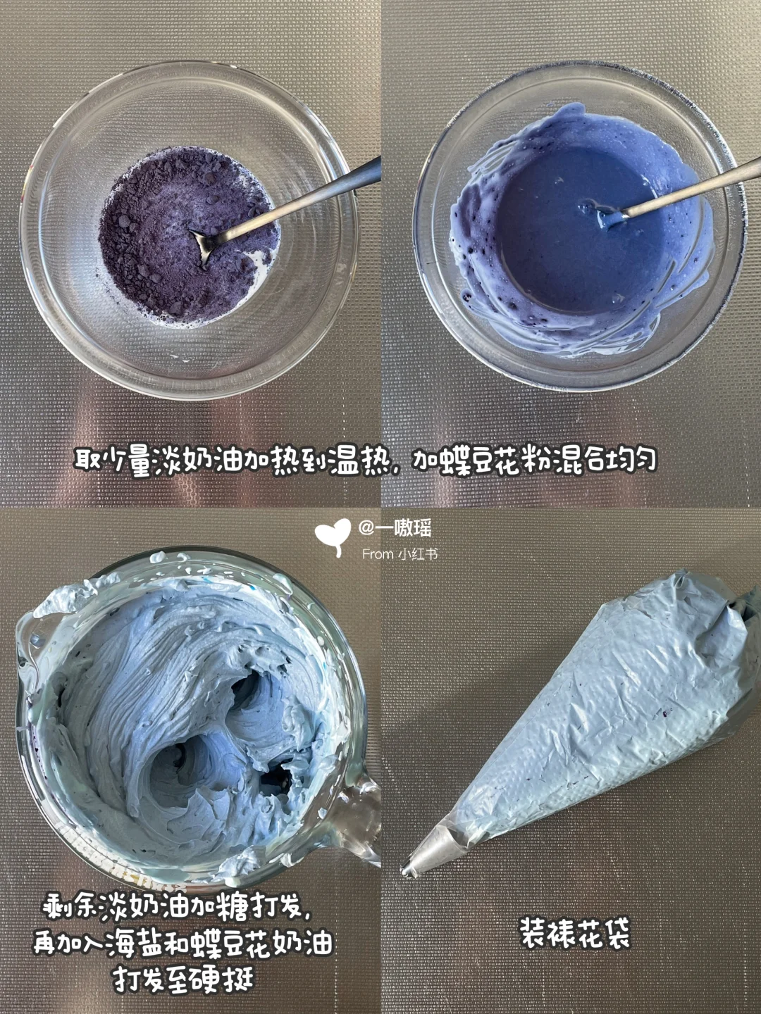 ▪️取少量淡奶油加热到温热,加蝶豆花粉混合均匀
