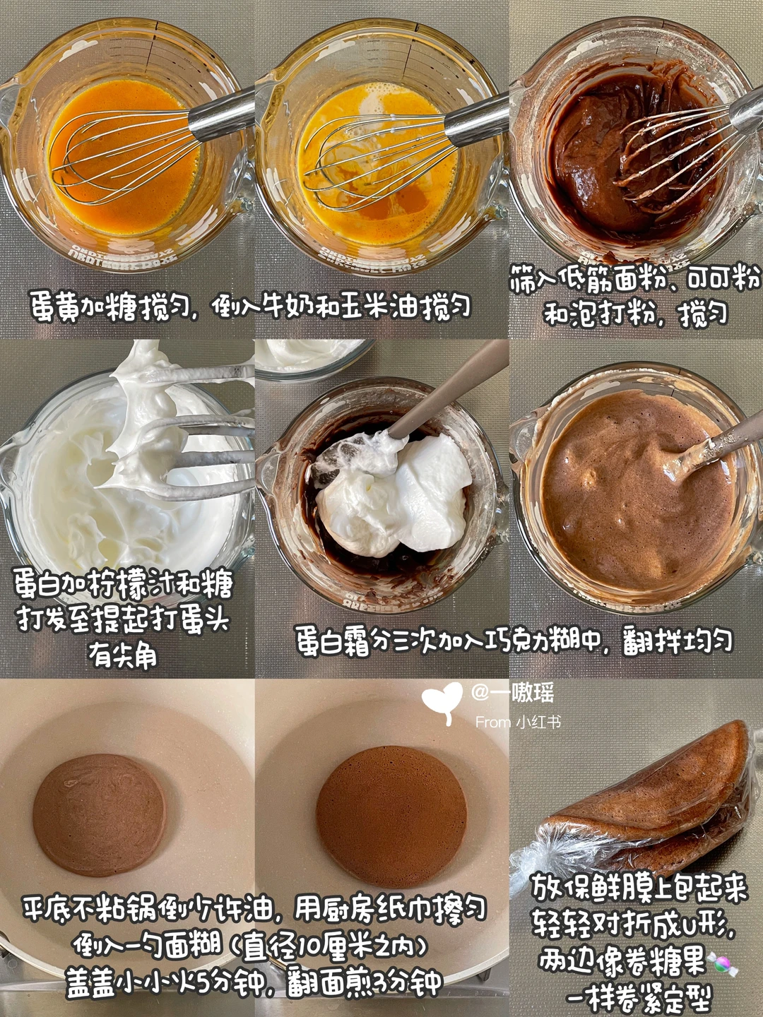蛋黄2个|糖8g(蛋黄用)|牛奶20g|玉米油5g|低筋面粉30g|可可粉8g|泡打粉1g|蛋白2个|糖22g(蛋白用)|柠檬汁5g