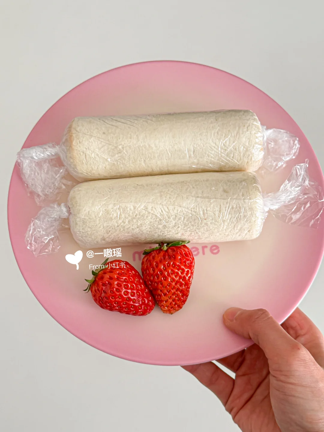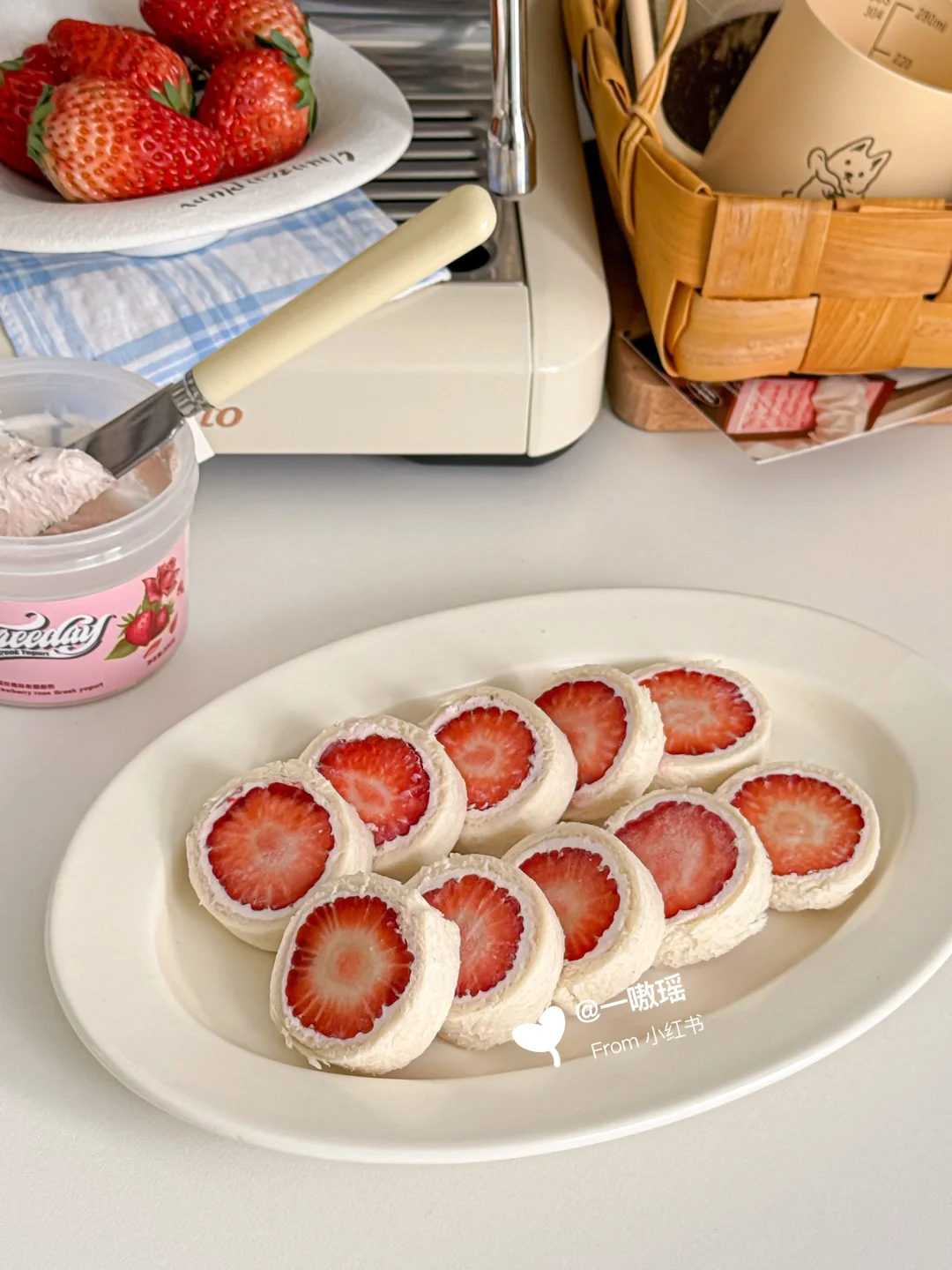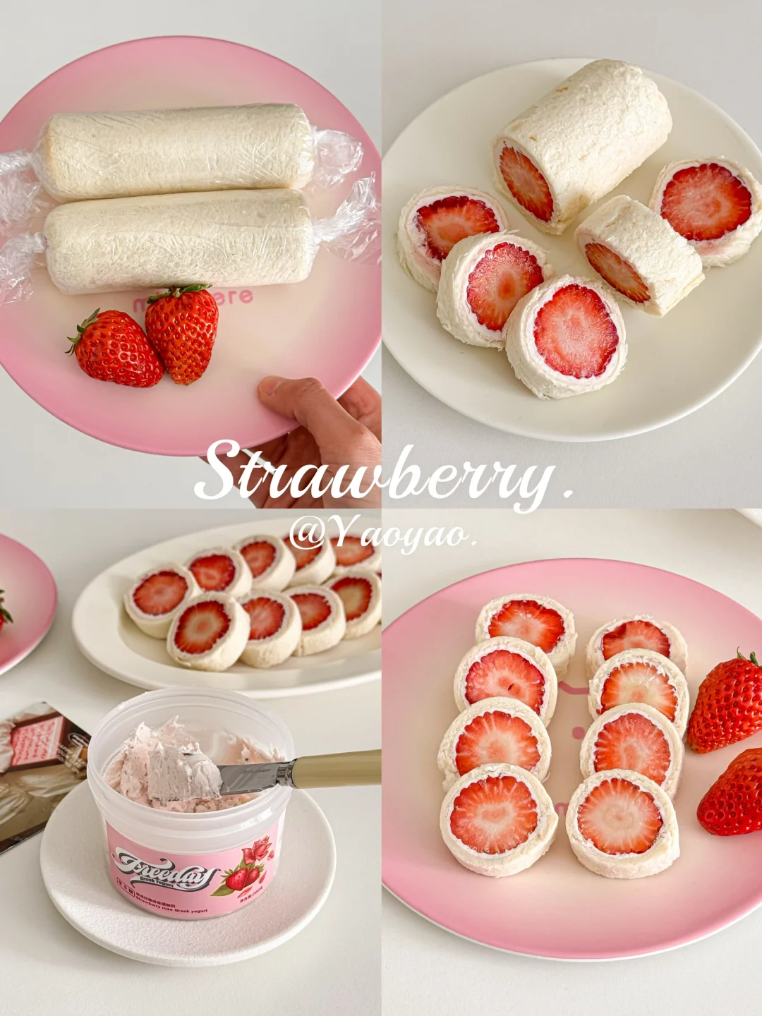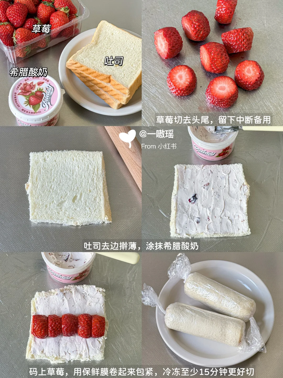 贪心的想在草莓季把草莓相关的美食做个遍~ 今天轮到可可爱爱的草莓酸奶吐司卷儿 一口☝️个,清爽多汁奶呼呼的💦🍓 而且!低卡无负担喲 - 🛒食材 吐司|草莓|超厚的希腊酸奶 👩🏻🍳做法 ▫️草莓切去头尾,留下中断备用 ▫️吐司去边擀薄,涂抹希腊酸奶 ▫️码上草莓,用保鲜膜卷起包紧 ▫️冷冻至少15分钟更好切
