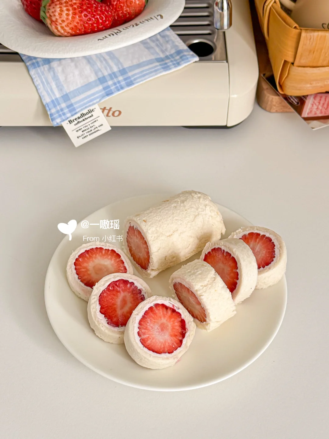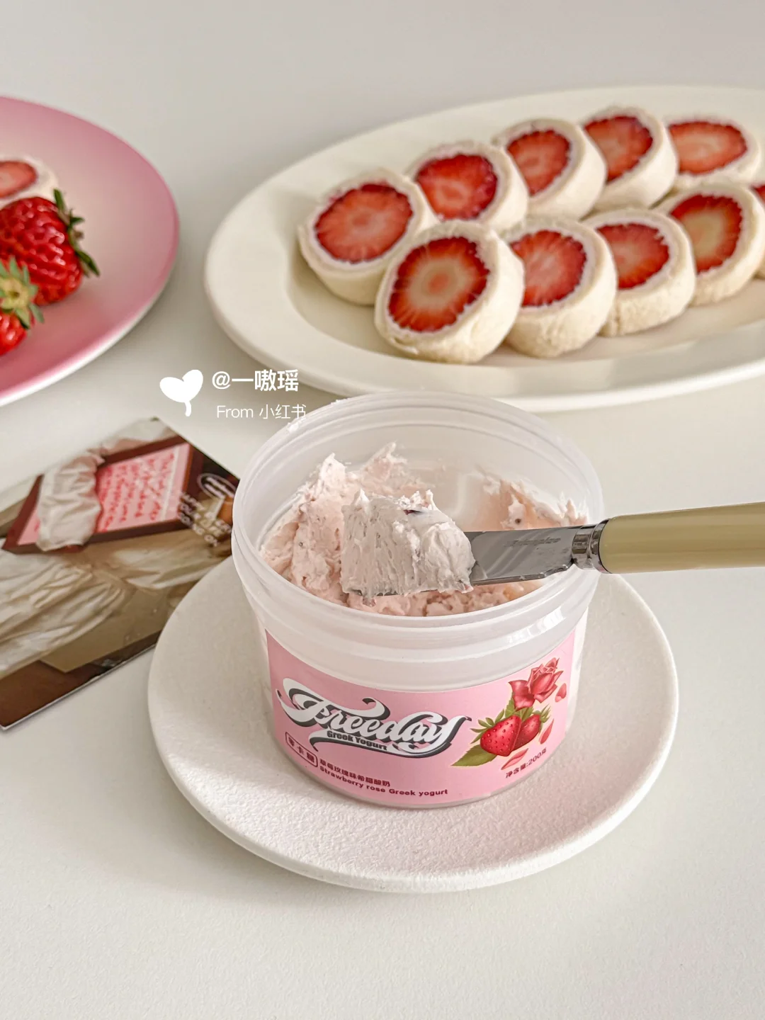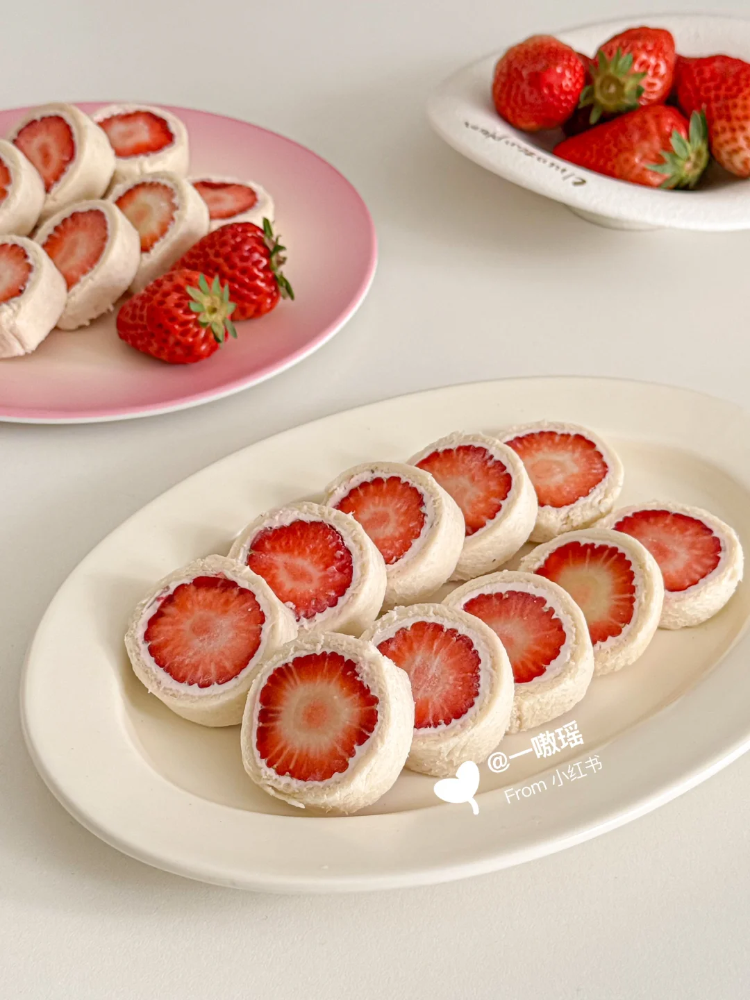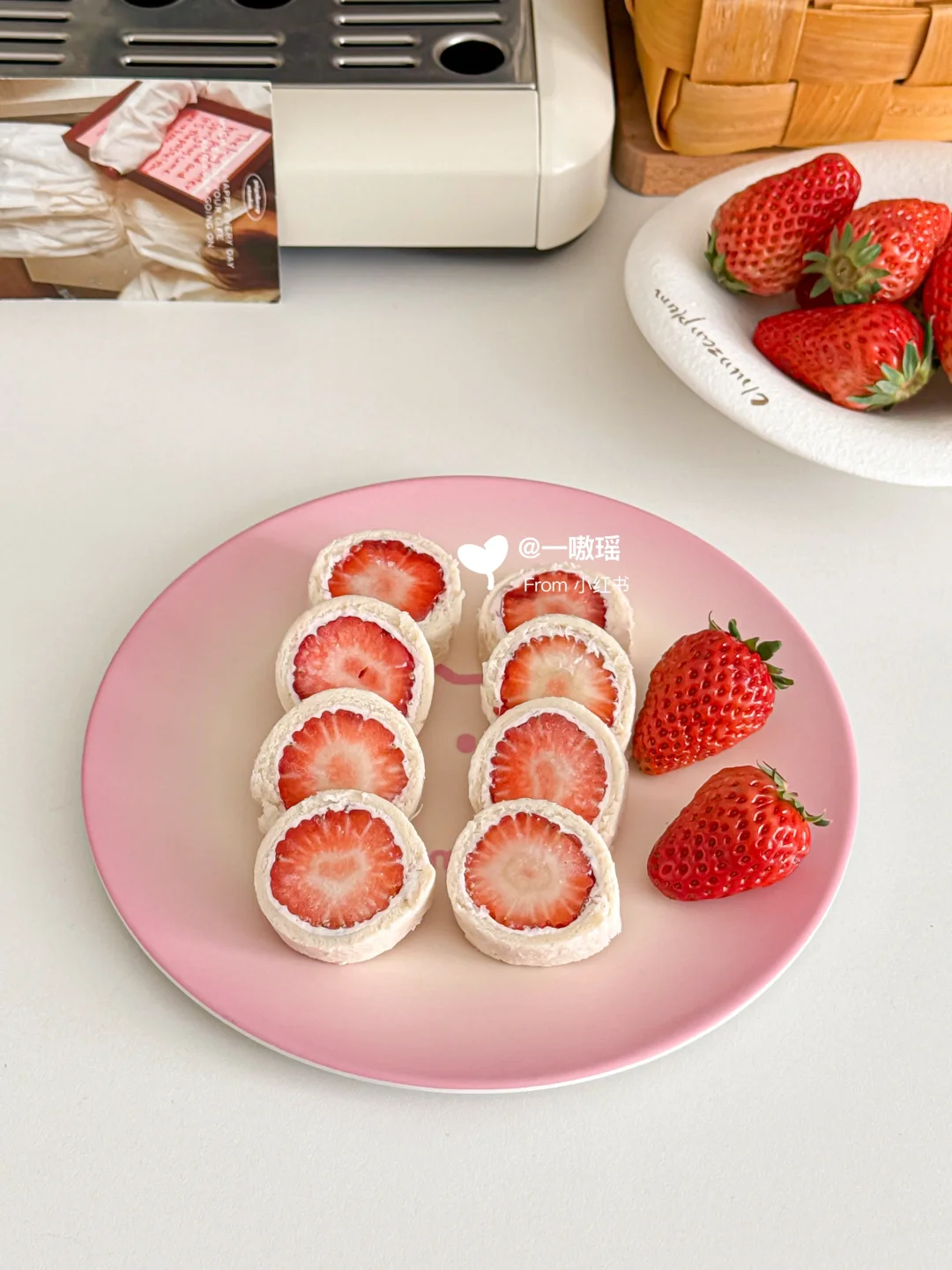 贪心的想在草莓季把草莓相关的美食做个遍~ 今天轮到可可爱爱的草莓酸奶吐司卷儿 一口☝️个,清爽多汁奶呼呼的💦🍓 而且!低卡无负担喲 - 🛒食材 吐司|草莓|超厚的希腊酸奶 👩🏻🍳做法 ▫️草莓切去头尾,留下中断备用 ▫️吐司去边擀薄,涂抹希腊酸奶 ▫️码上草莓,用保鲜膜卷起包紧 ▫️冷冻至少15分钟更好切