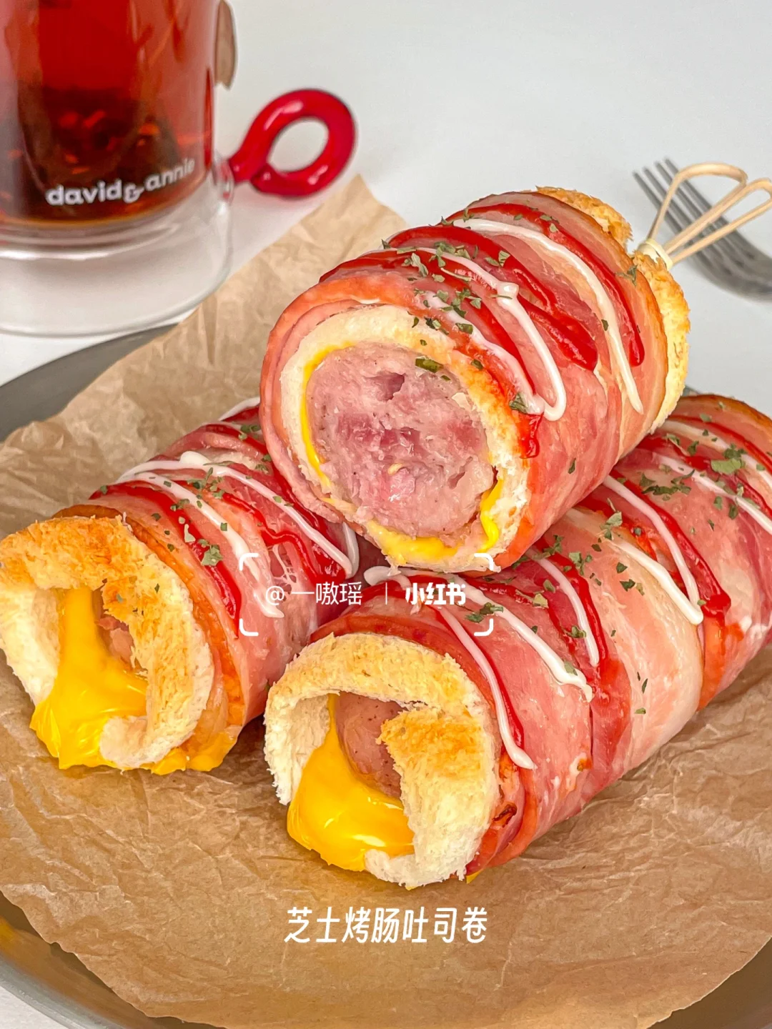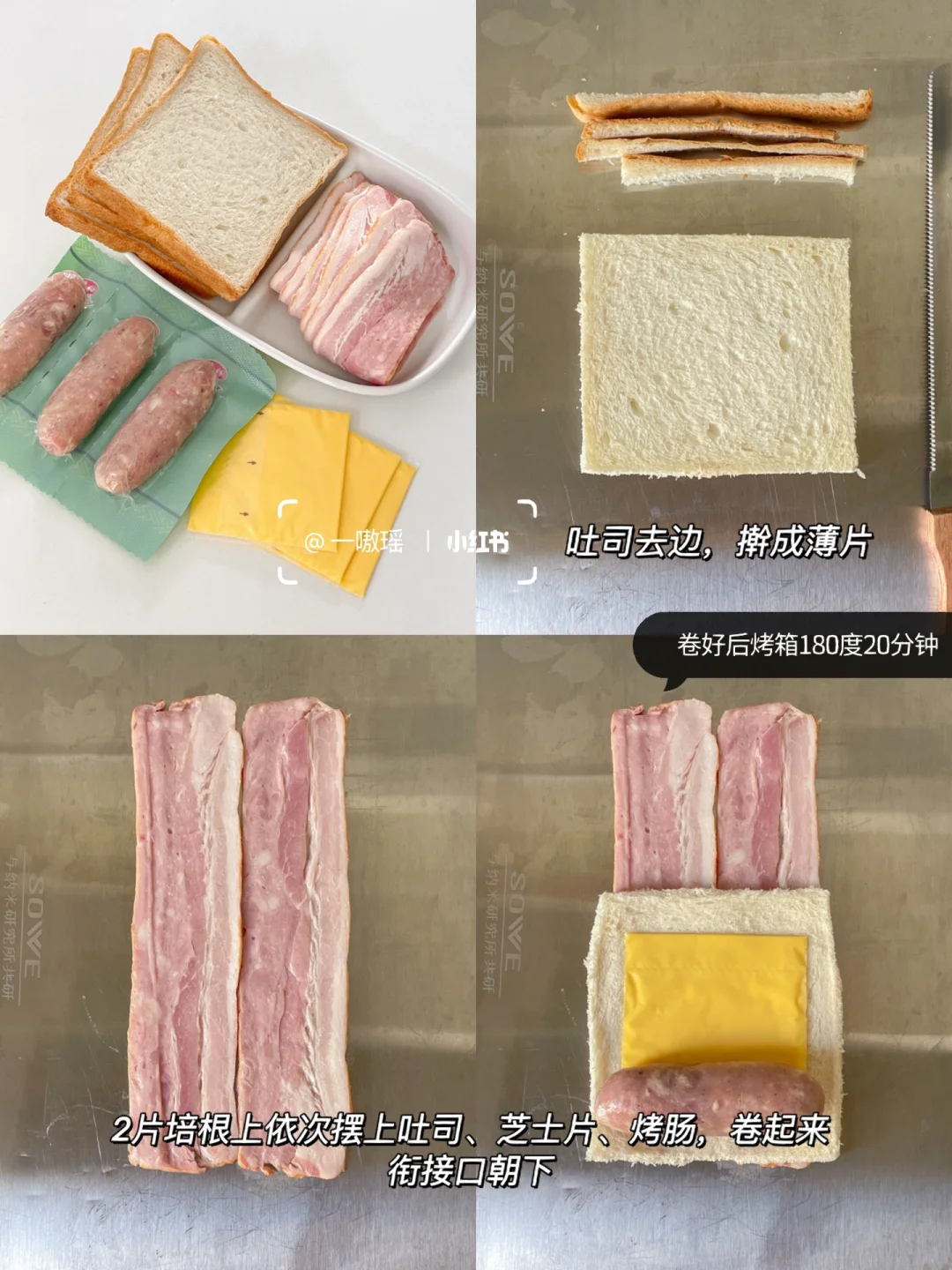 食材:吐司 烤肠 培根 芝士片 番茄酱 沙拉酱