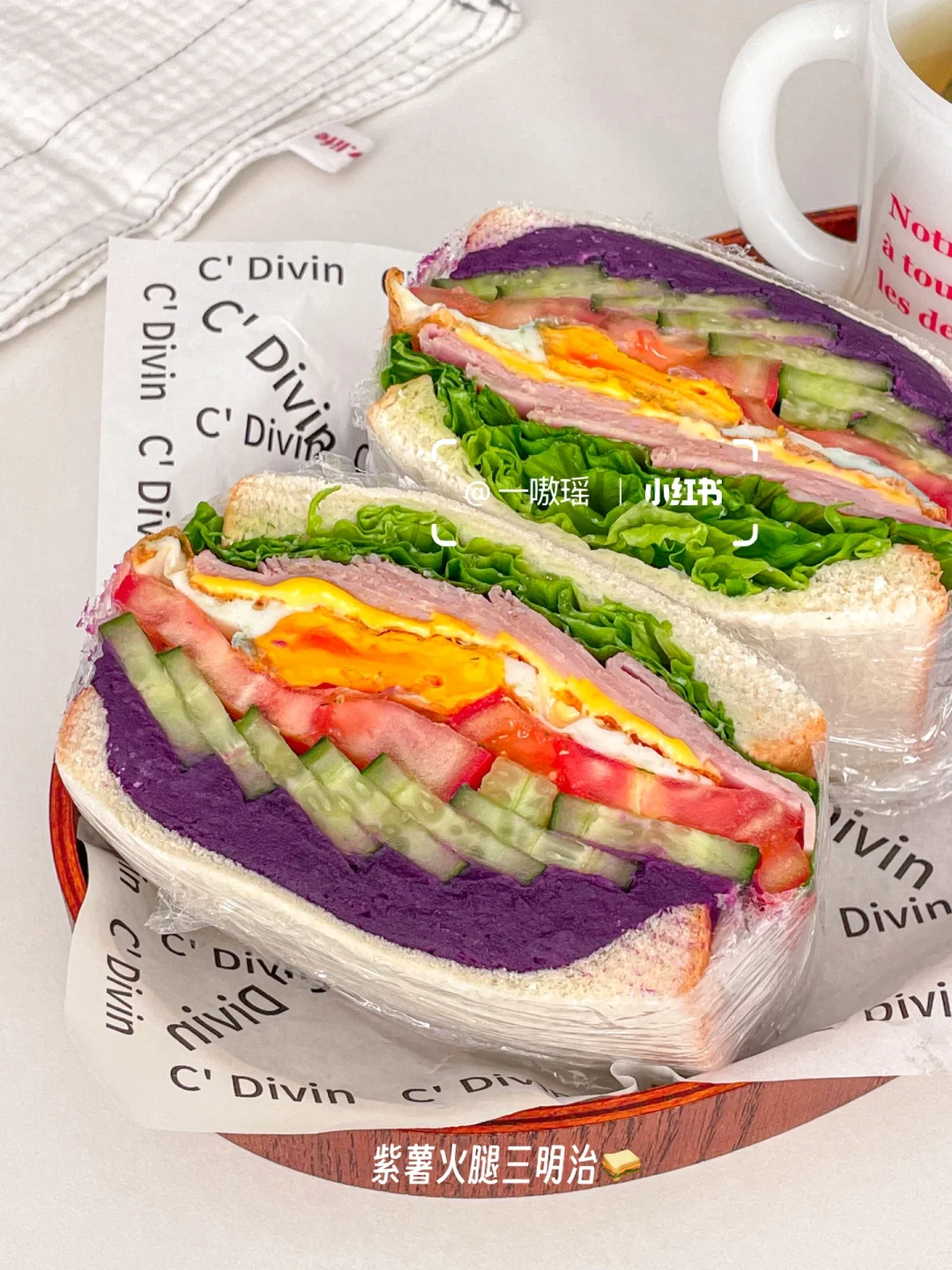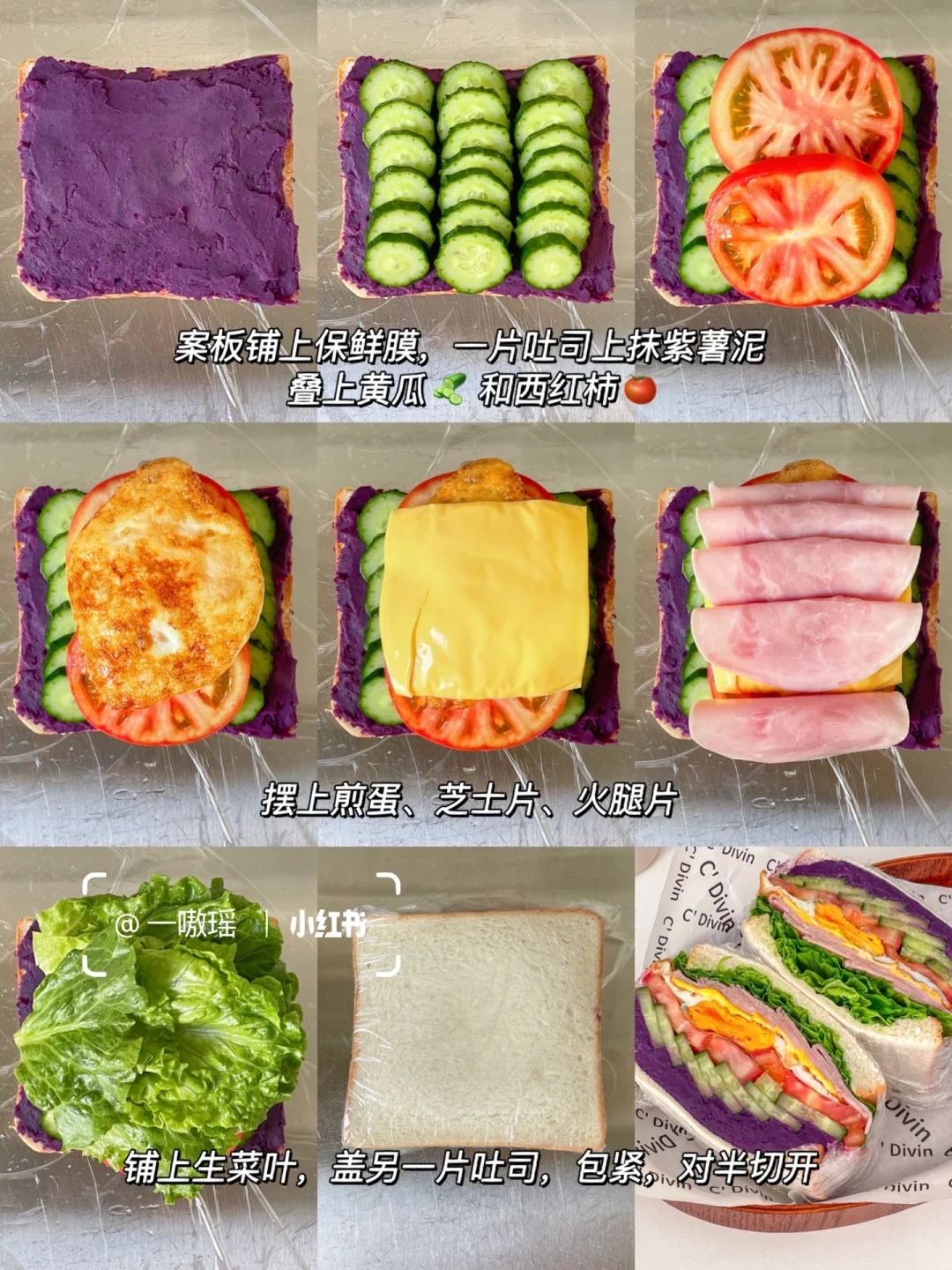 食材:吐司 火腿片 紫薯 黄瓜 生菜 西红柿 芝士片 鸡蛋