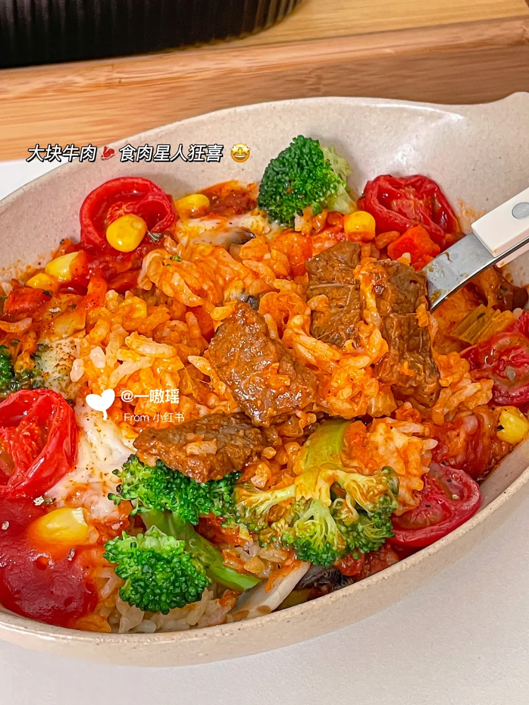 🍅意式番茄牛肉焗饭,牛肉也很大块,蔬菜多多甚至还给摆好了盘,连大米都很好,香甜软糯,诚意满满