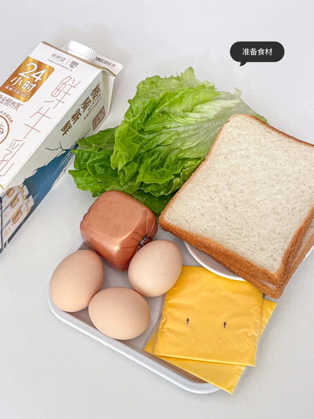 吐司2片 鸡蛋3个 牛奶20ml 午餐肉150g 芝士2片 生菜少许